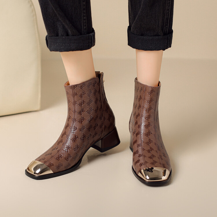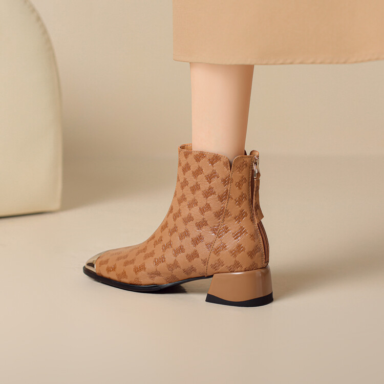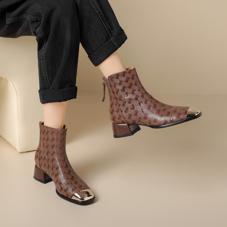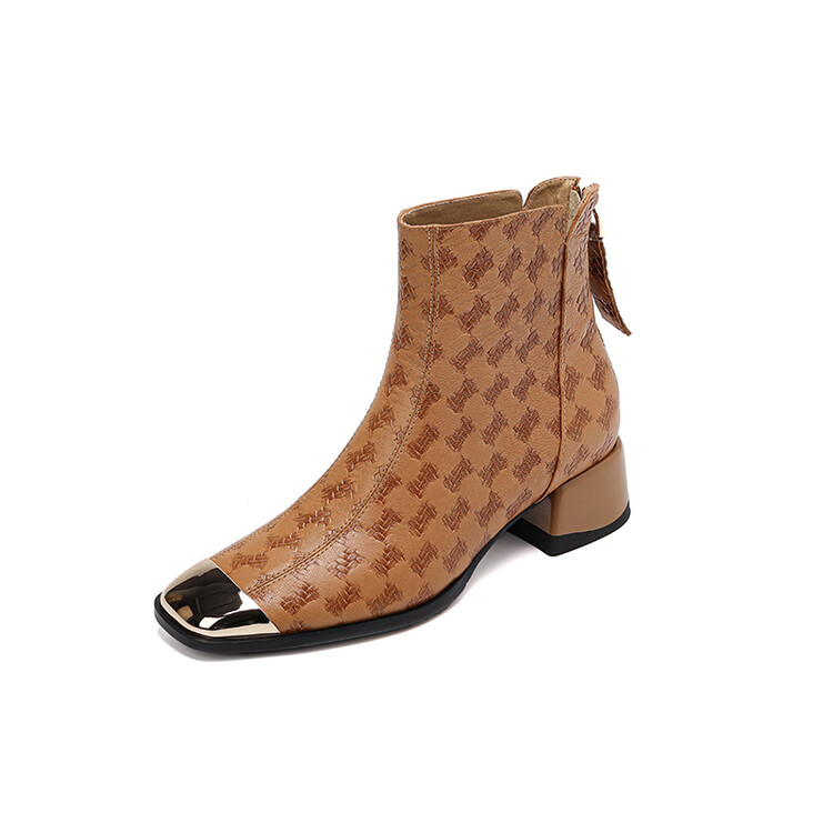 防撞铁头印花牛皮短靴2024秋冬新款粗跟不累脚马丁靴绒里女靴百搭