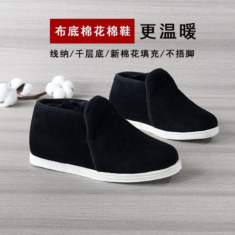 黑色棉花布底鞋男冬天家居防臭千层底套脚棉鞋高帮加绒老年保暖鞋