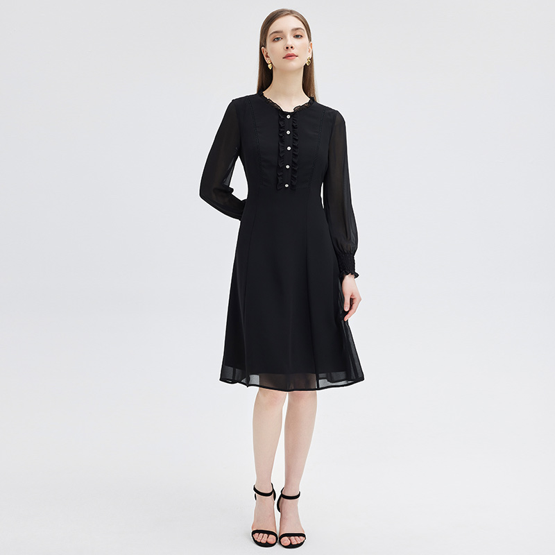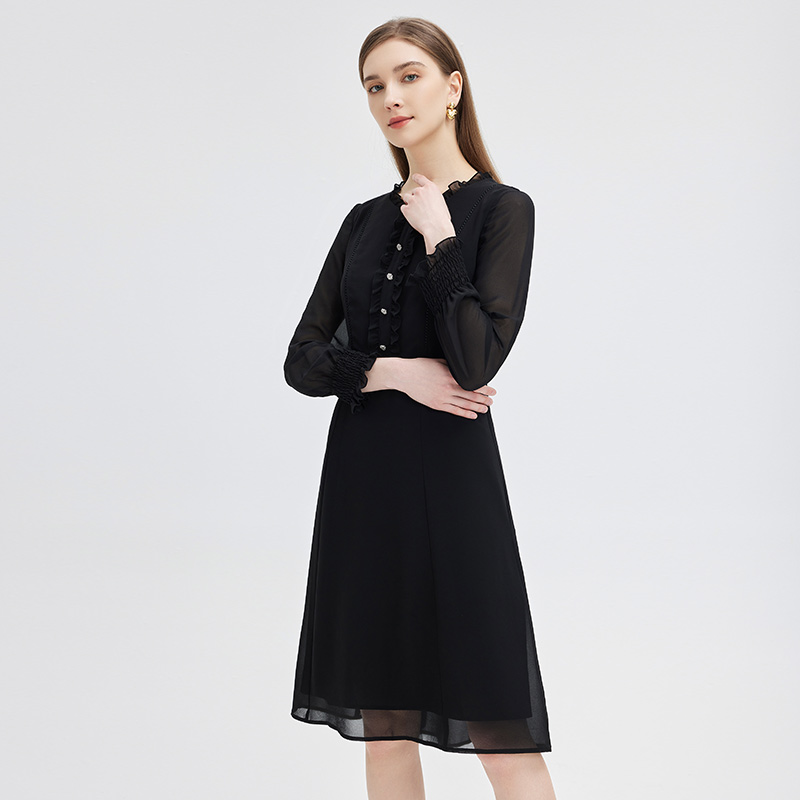 专柜正品马天奴女秋黑色排扣雪纺连衣裙子气质长裙收腰礼裙