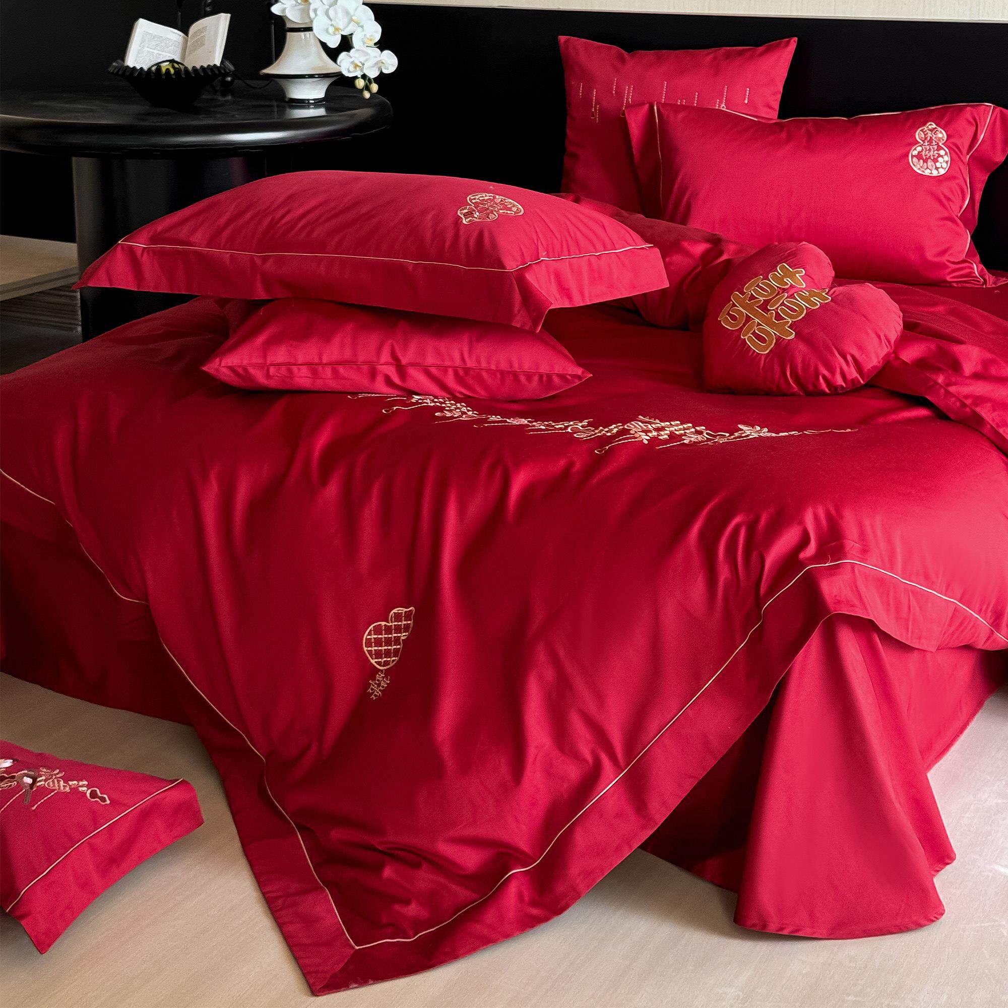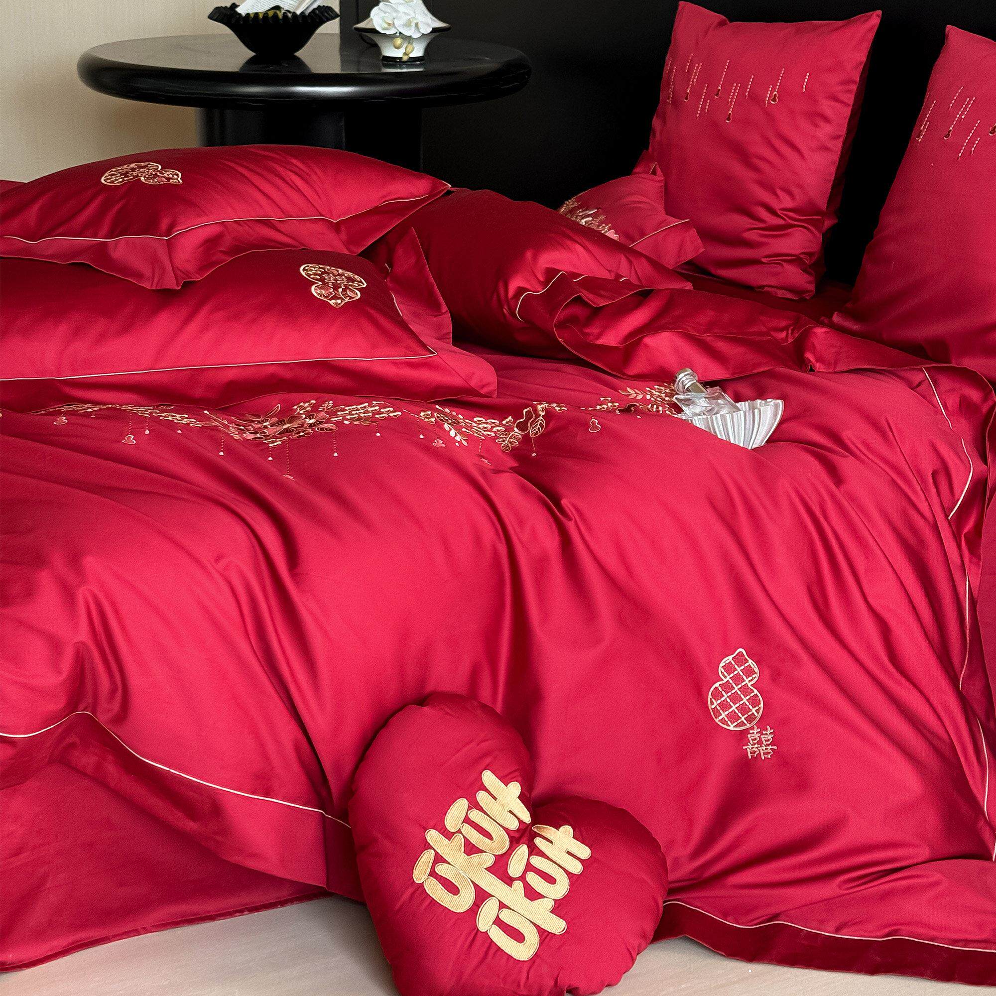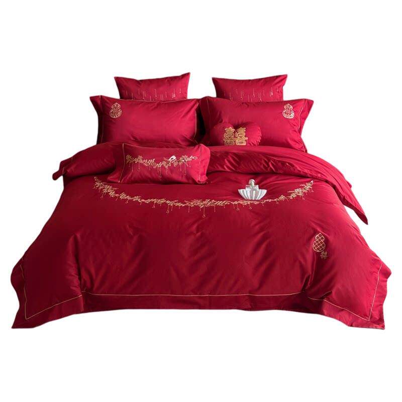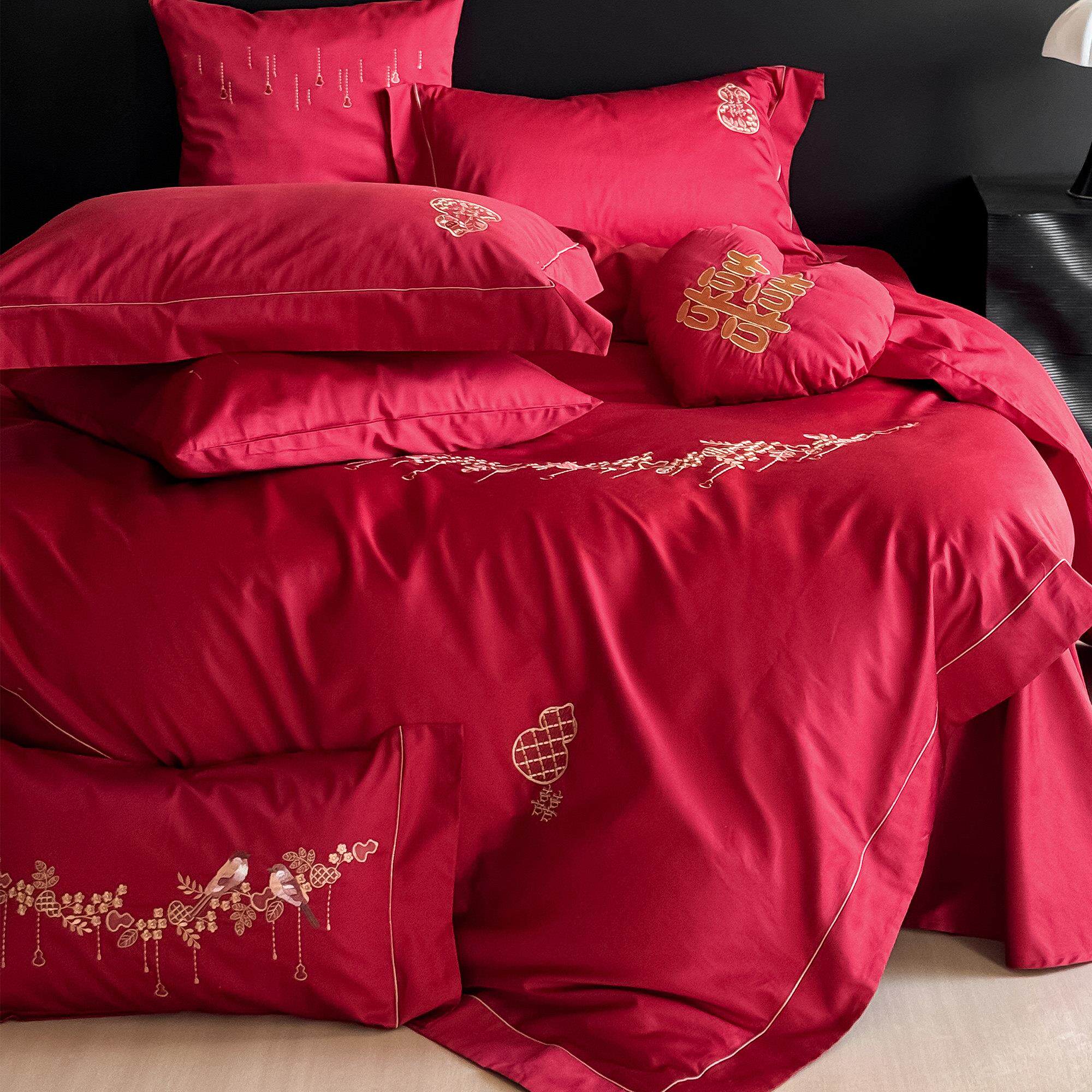 简约新中式婚庆床上四件套全棉100S长绒棉刺绣花红色结婚被套床单