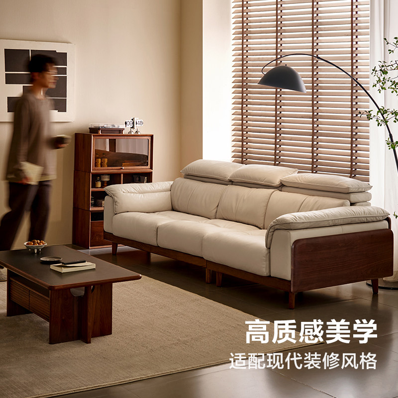 【U标·胡桃纪·头枕可调沙发】全友家居黑胡桃木实木真皮沙发