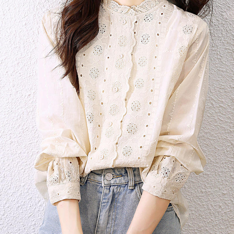 女式衬衫2026春装新款小衫蕾丝木耳领杏色上衣长袖刺绣花纯棉衬衣