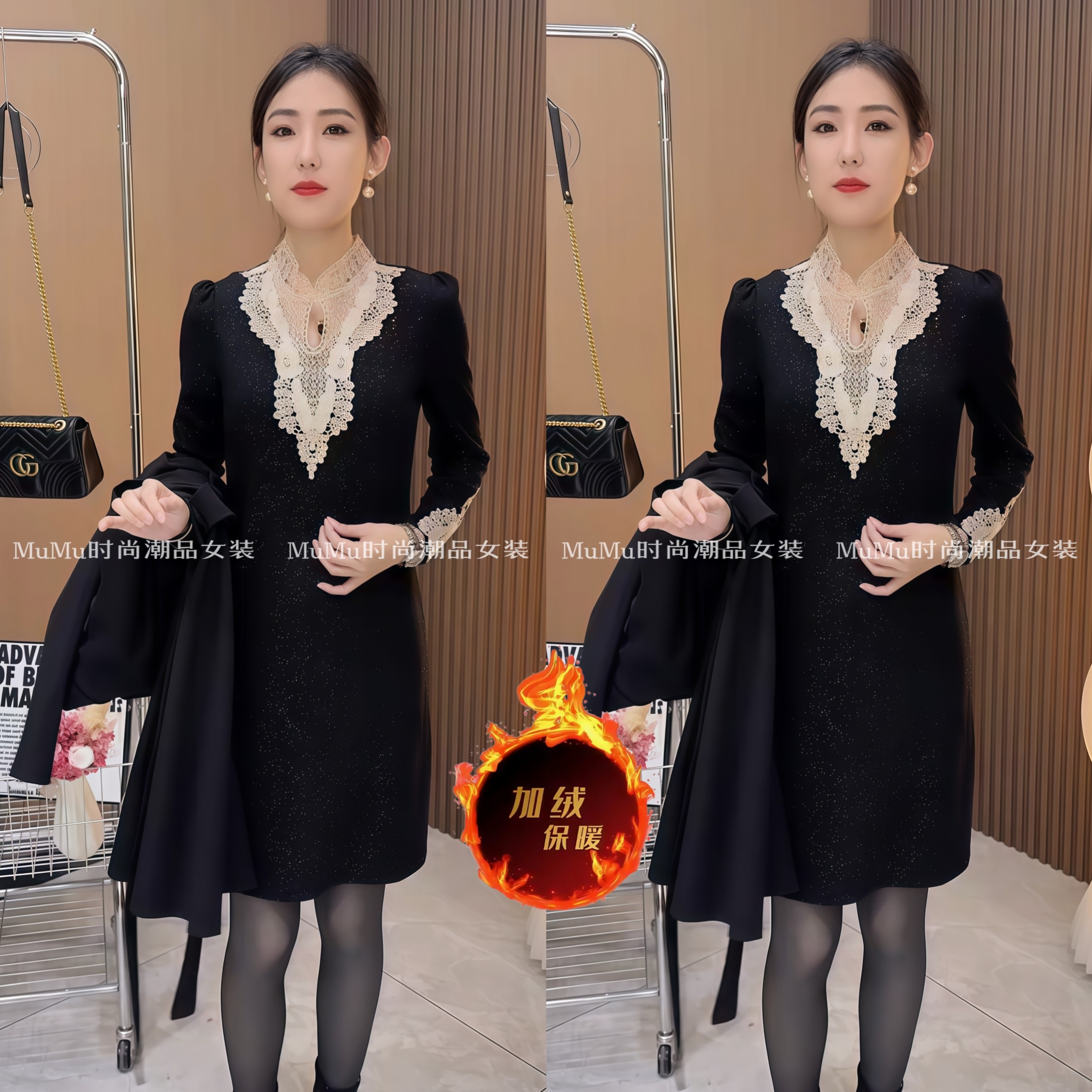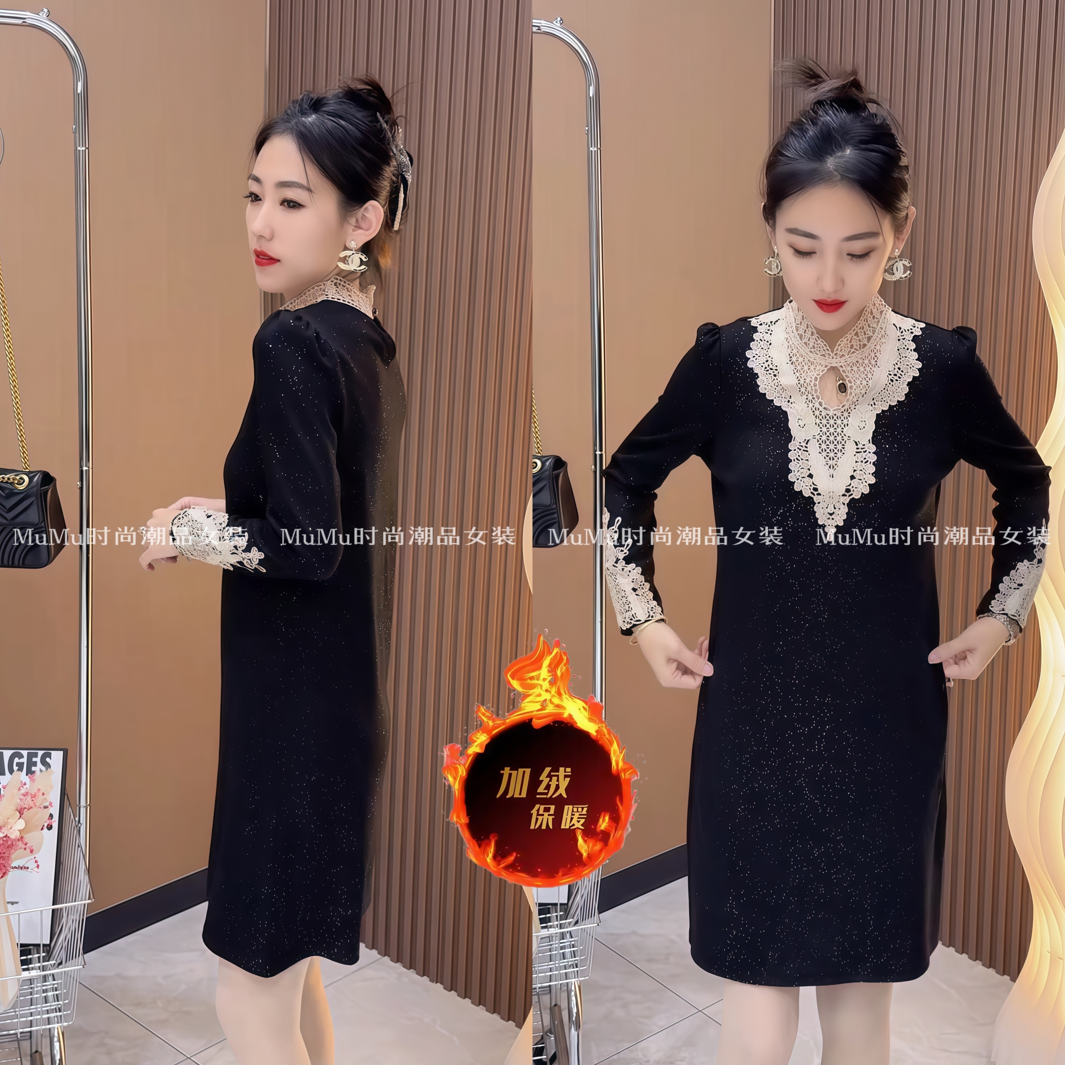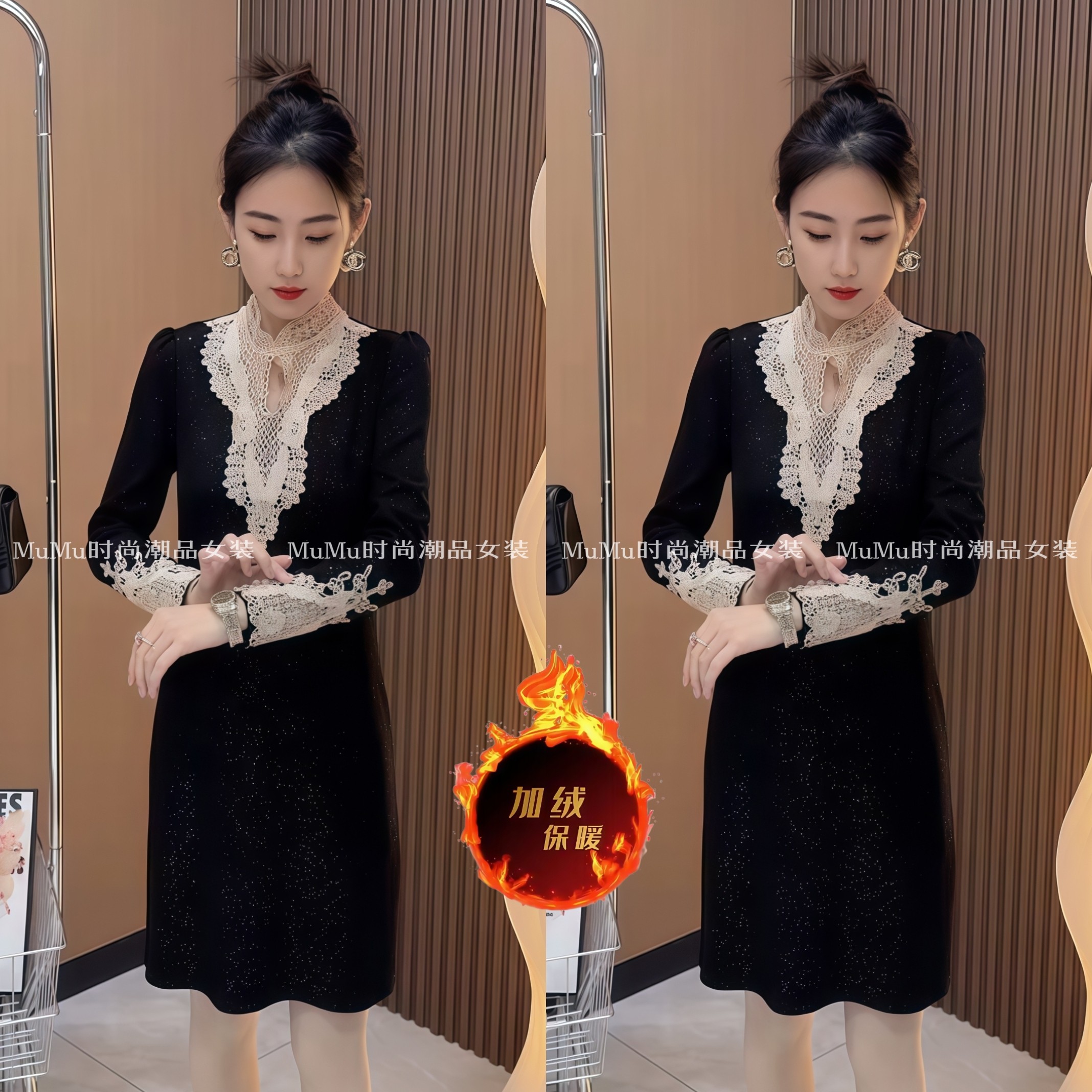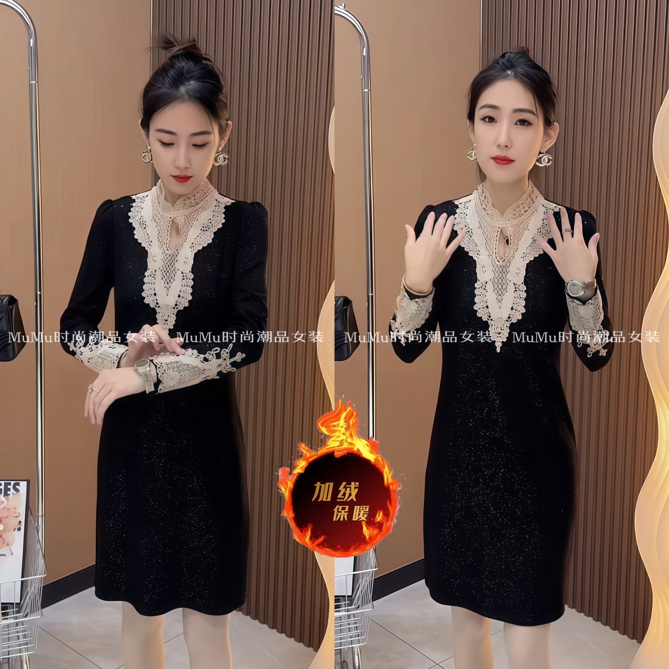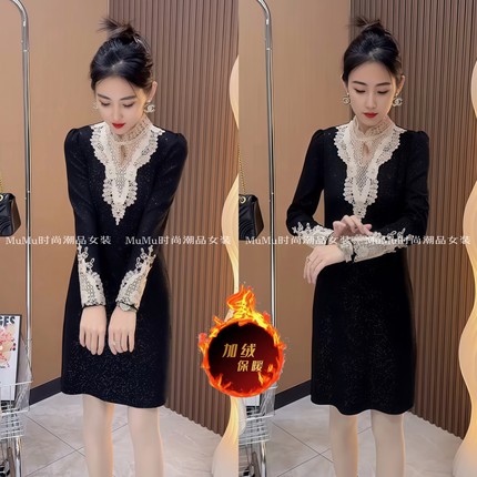 加绒连衣裙女秋冬新款黑色中长款打底裙修身显瘦蕾丝拼接内搭裙子