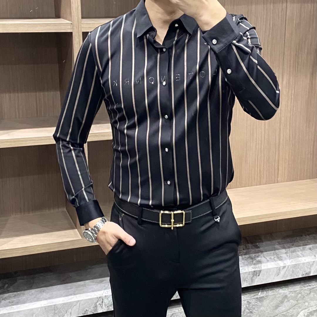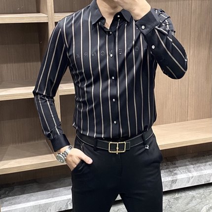 欧美2025秋季新款男士长袖衬衫时尚条纹字母烫钻商务绅士百搭衬衣