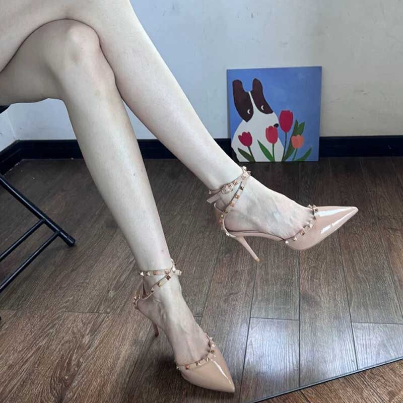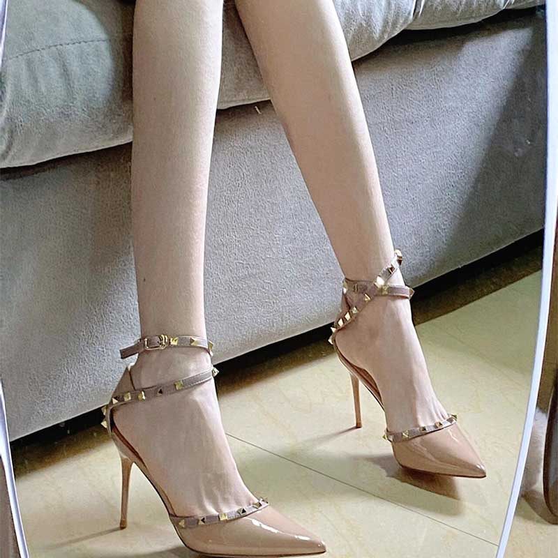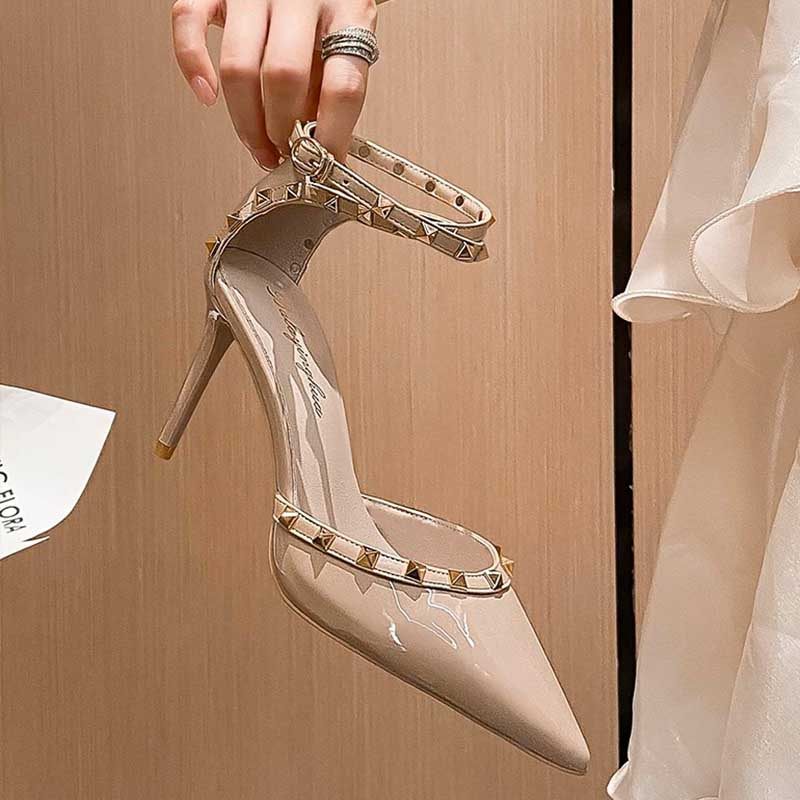 优尚品~百搭漆皮裸色绝美高跟鞋尖头包头铆钉细跟一字带中空凉鞋