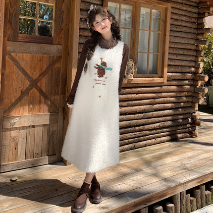 森女部落古着感叠穿毛绒背心裙2026新款百搭刺绣无袖连衣裙女秋冬