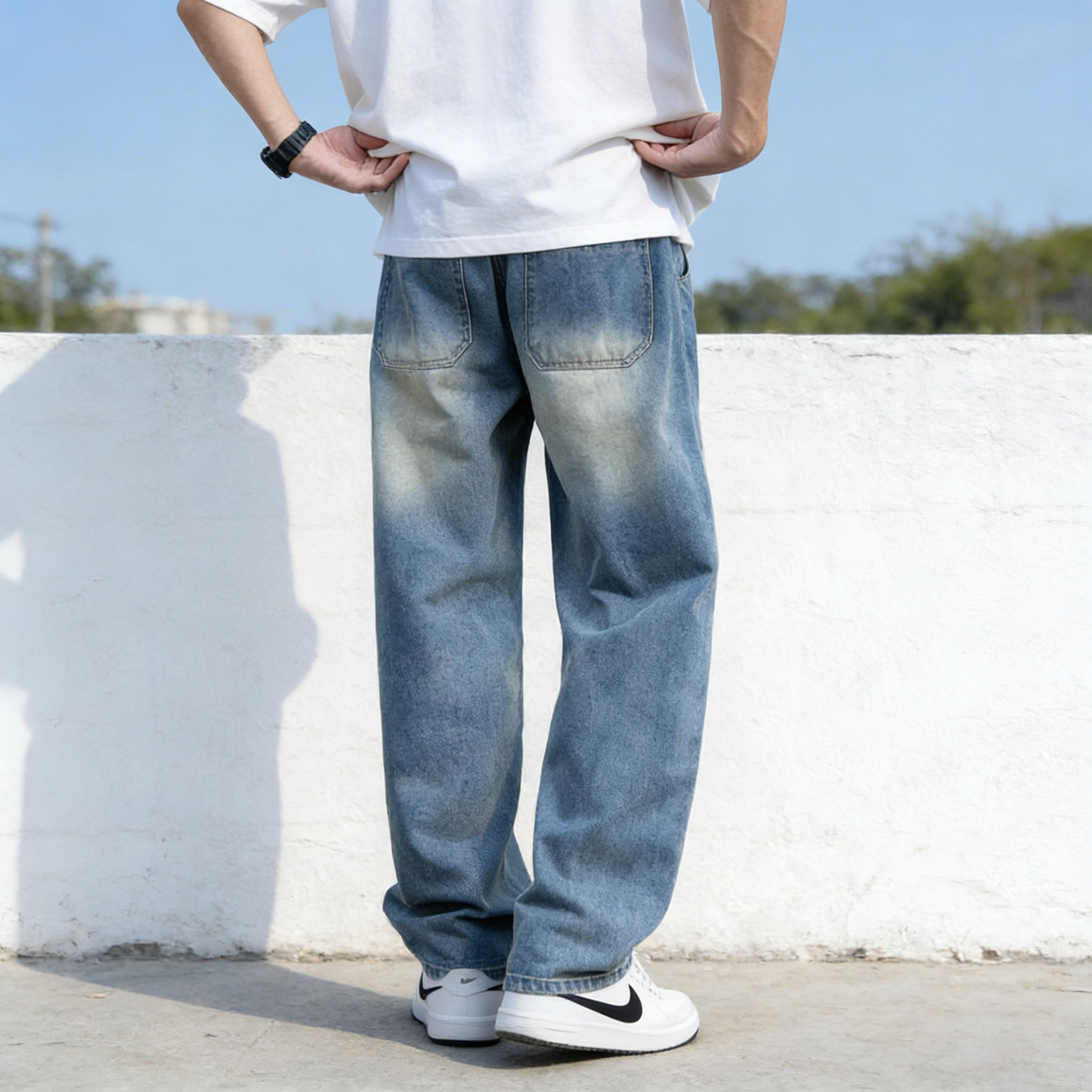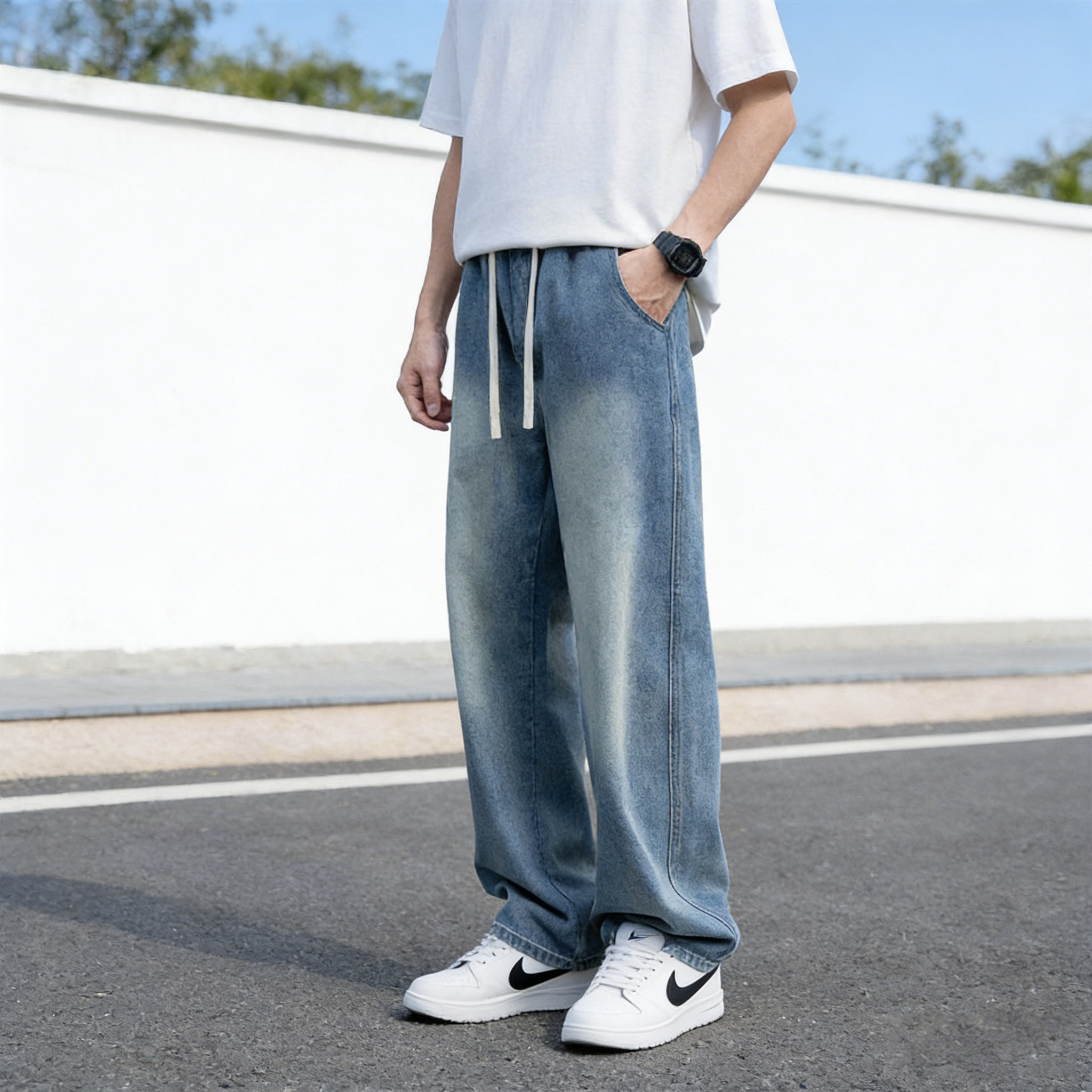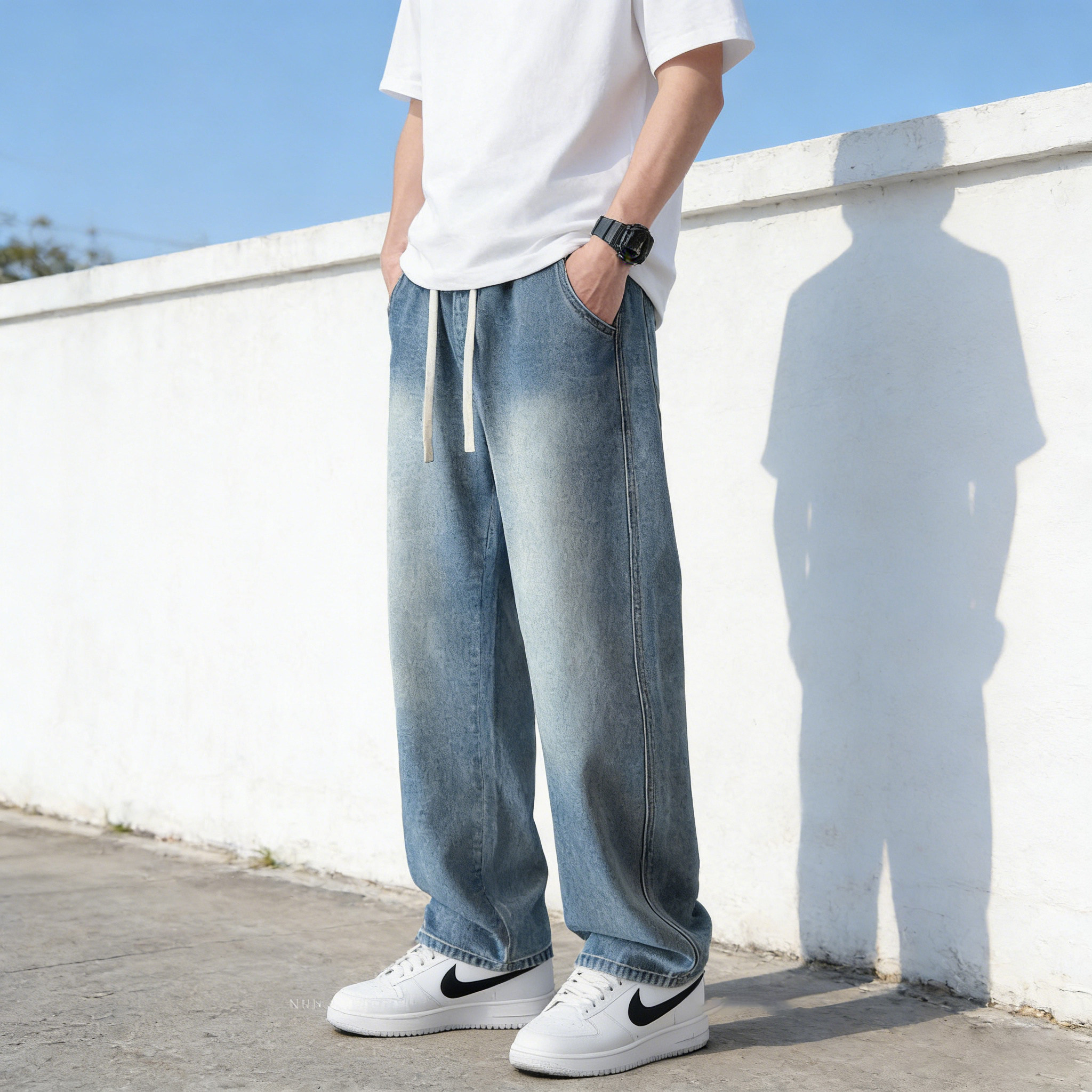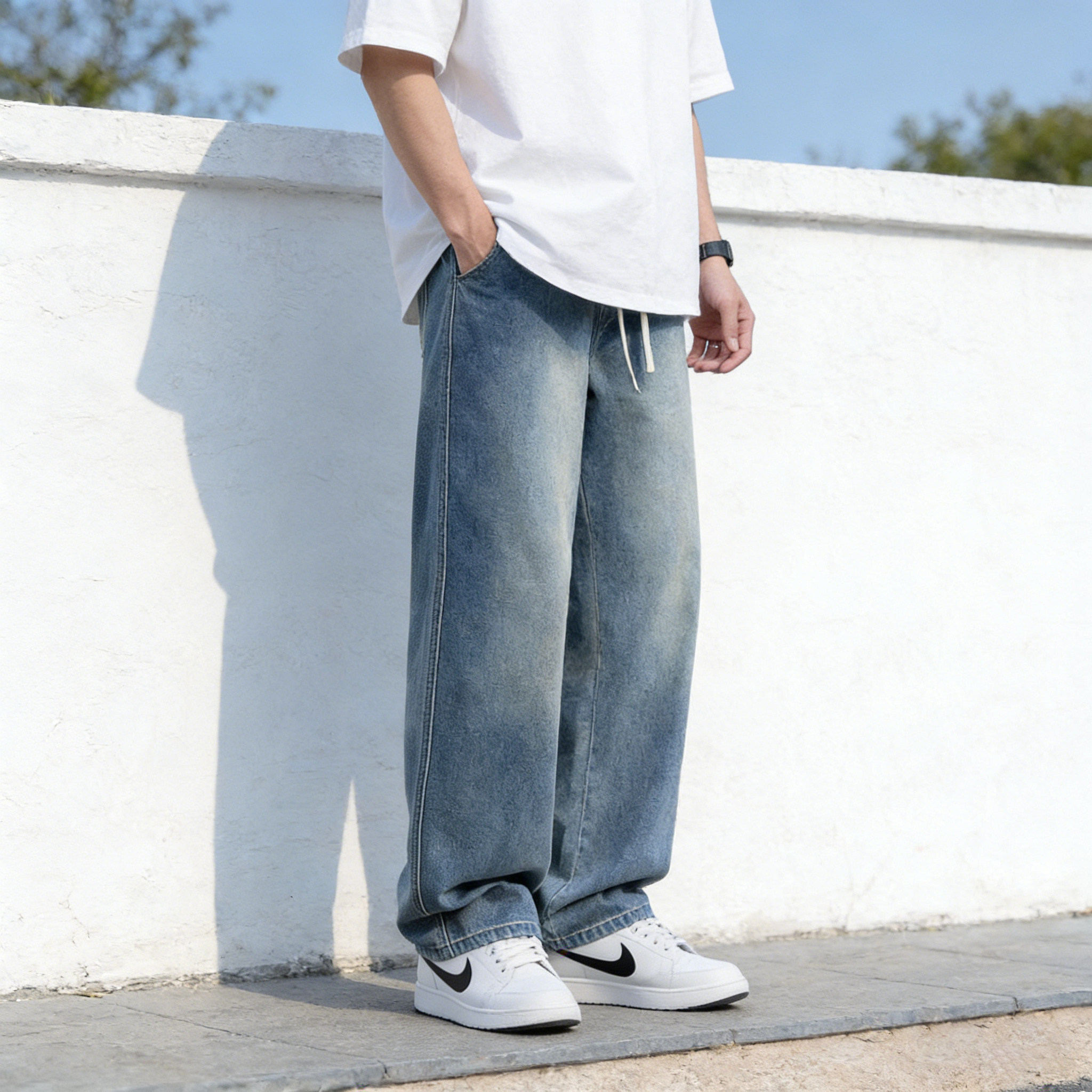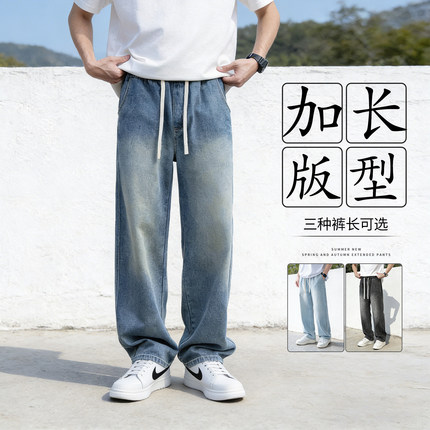 加长裤子高个子青少年春夏2026新款宽松直筒松紧腰复古牛仔裤男生