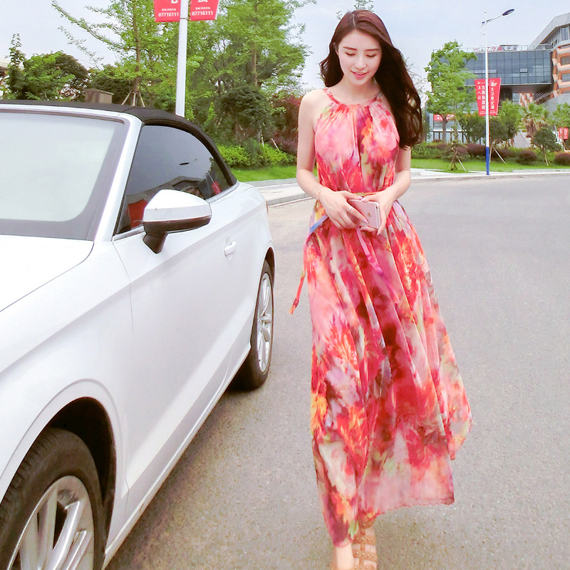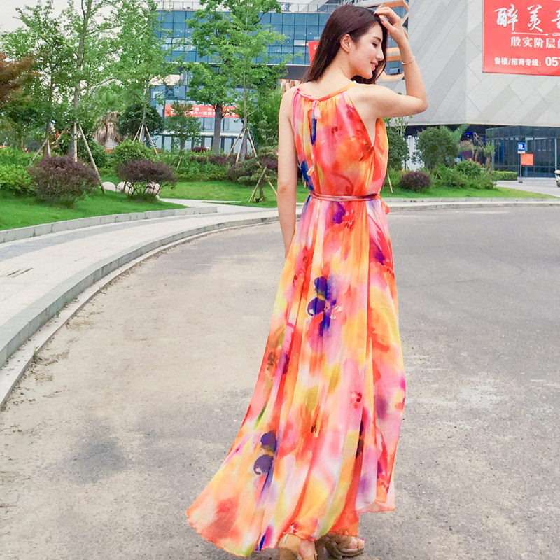夏季印花沙滩雪纺连衣裙大码波西米亚海边度假大裙摆吊带长裙