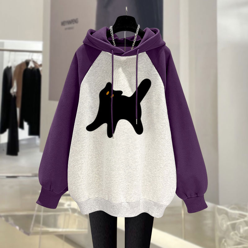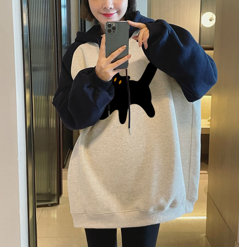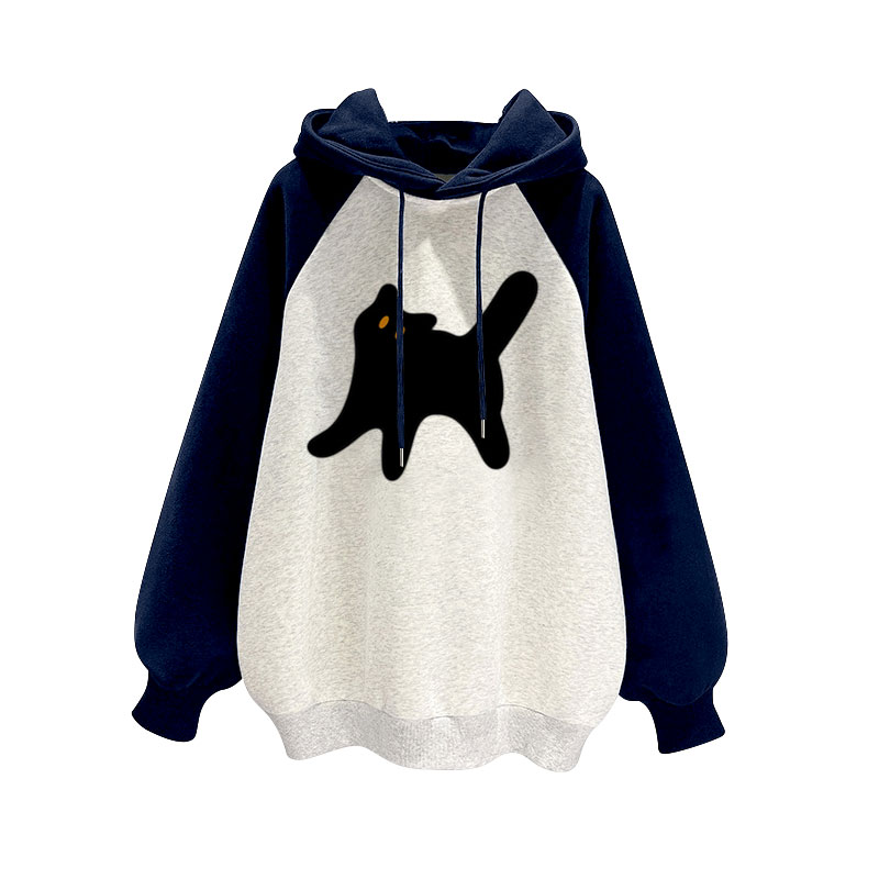 撞色插肩袖猫咪拼接连帽卫衣