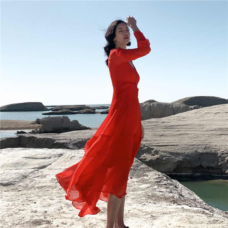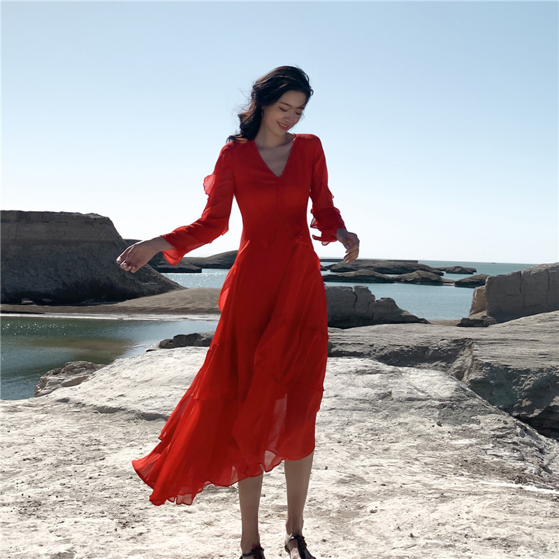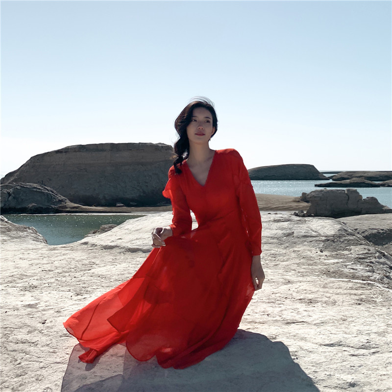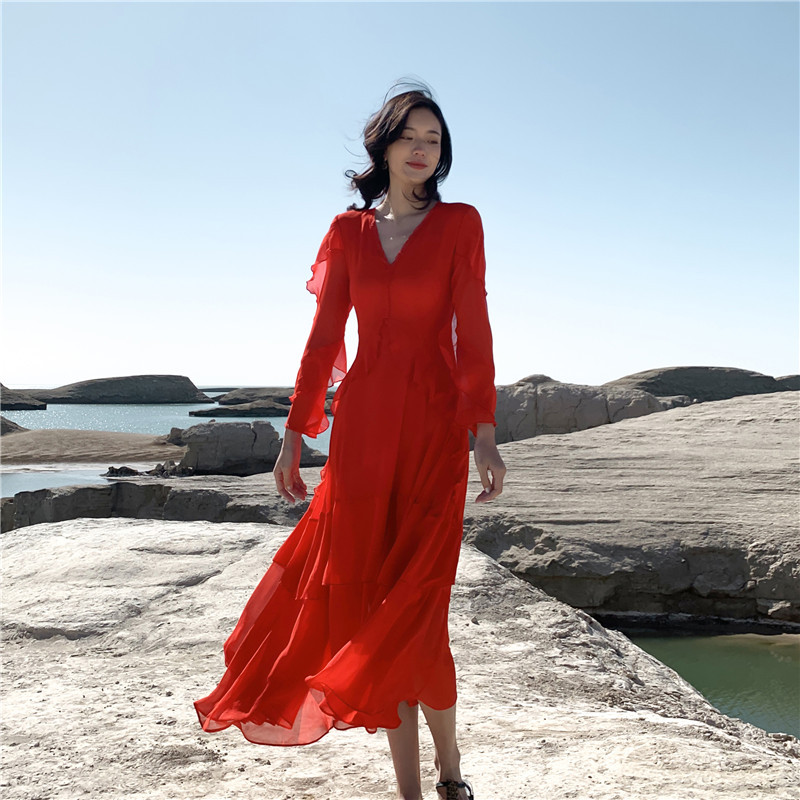 仅SFind红色飘逸旅拍连衣裙 沙滩裙度假仙雪纺荷叶边波西米亚长裙