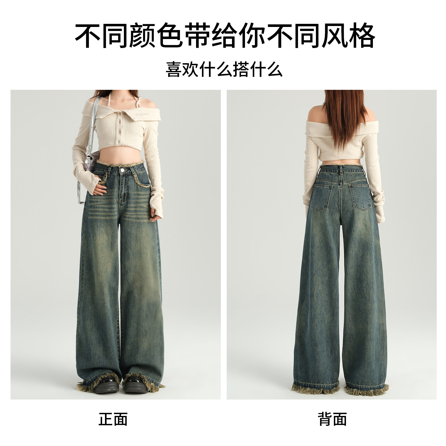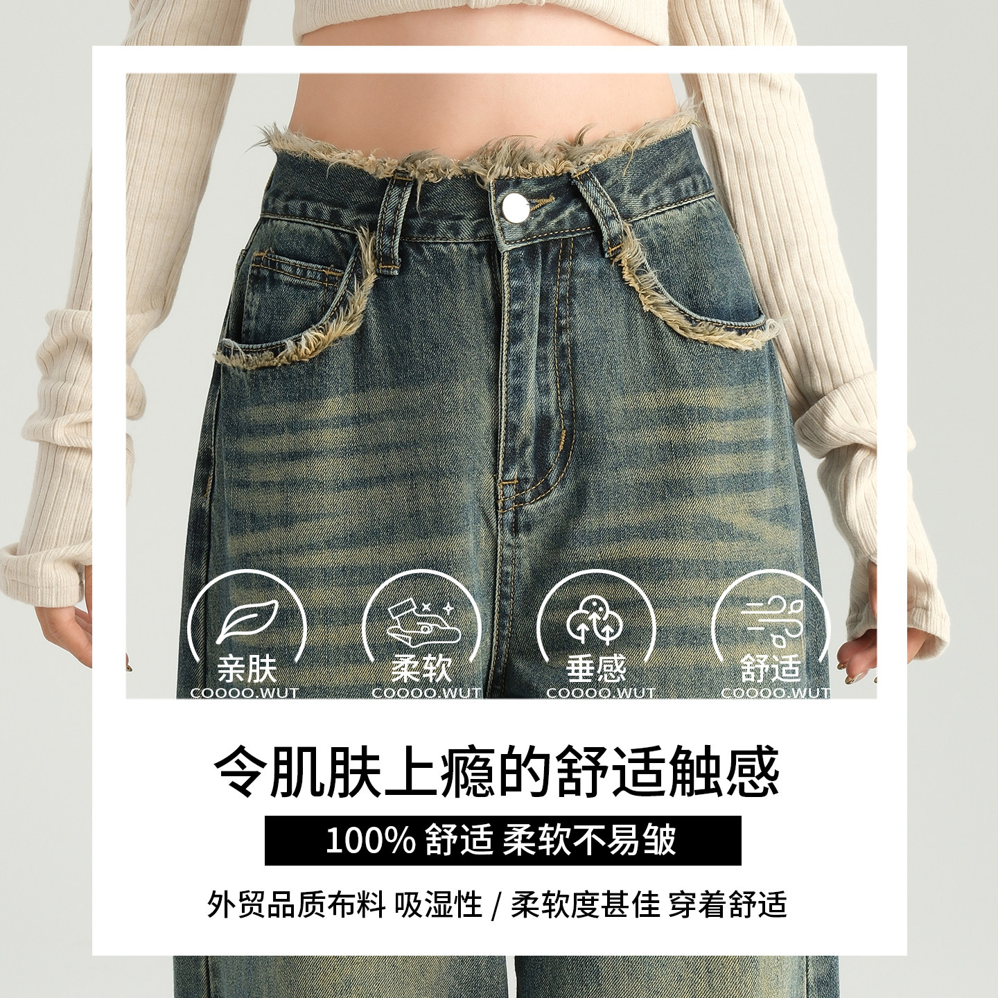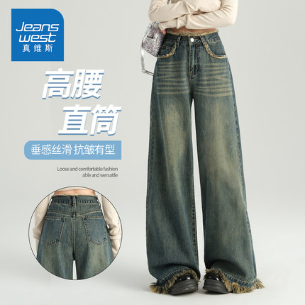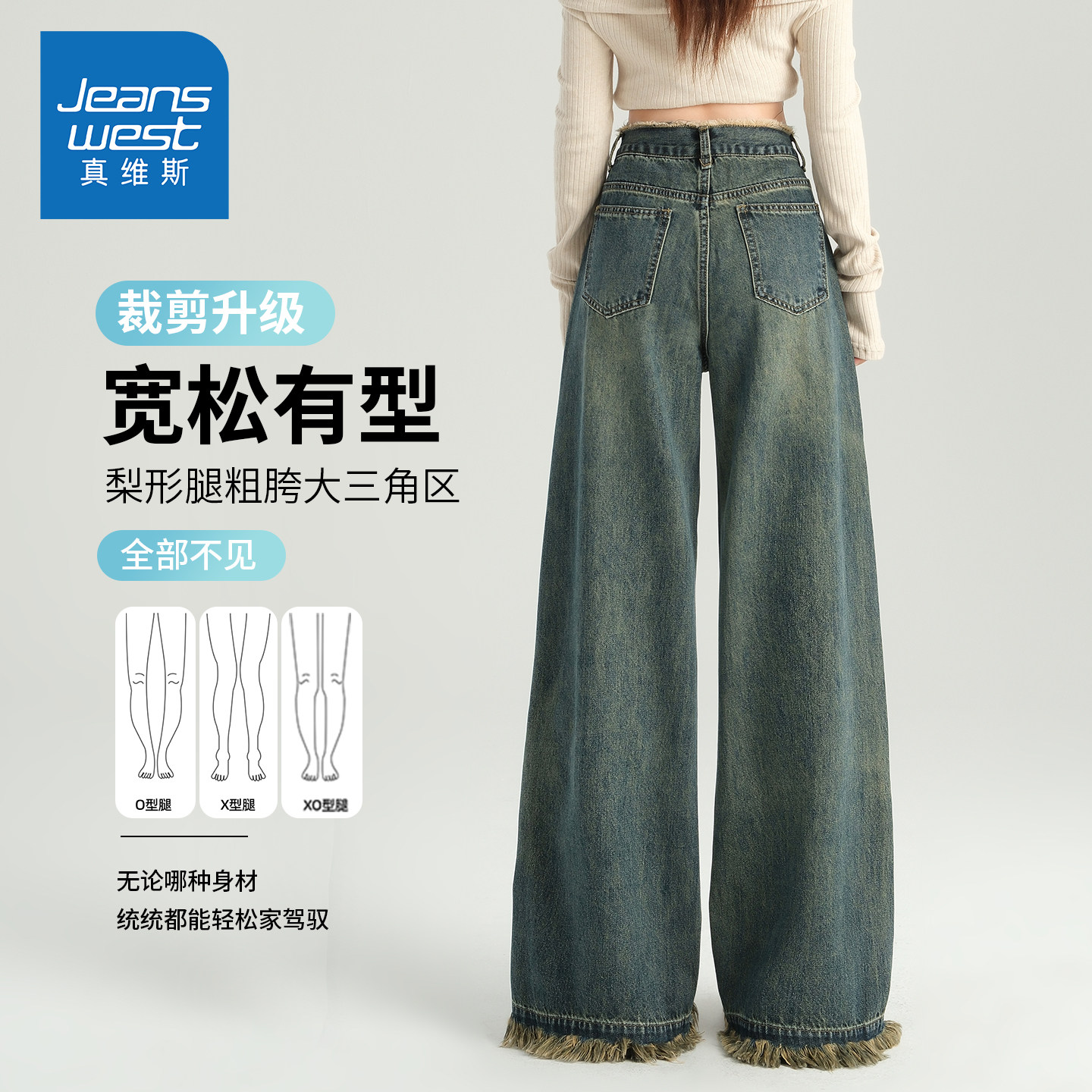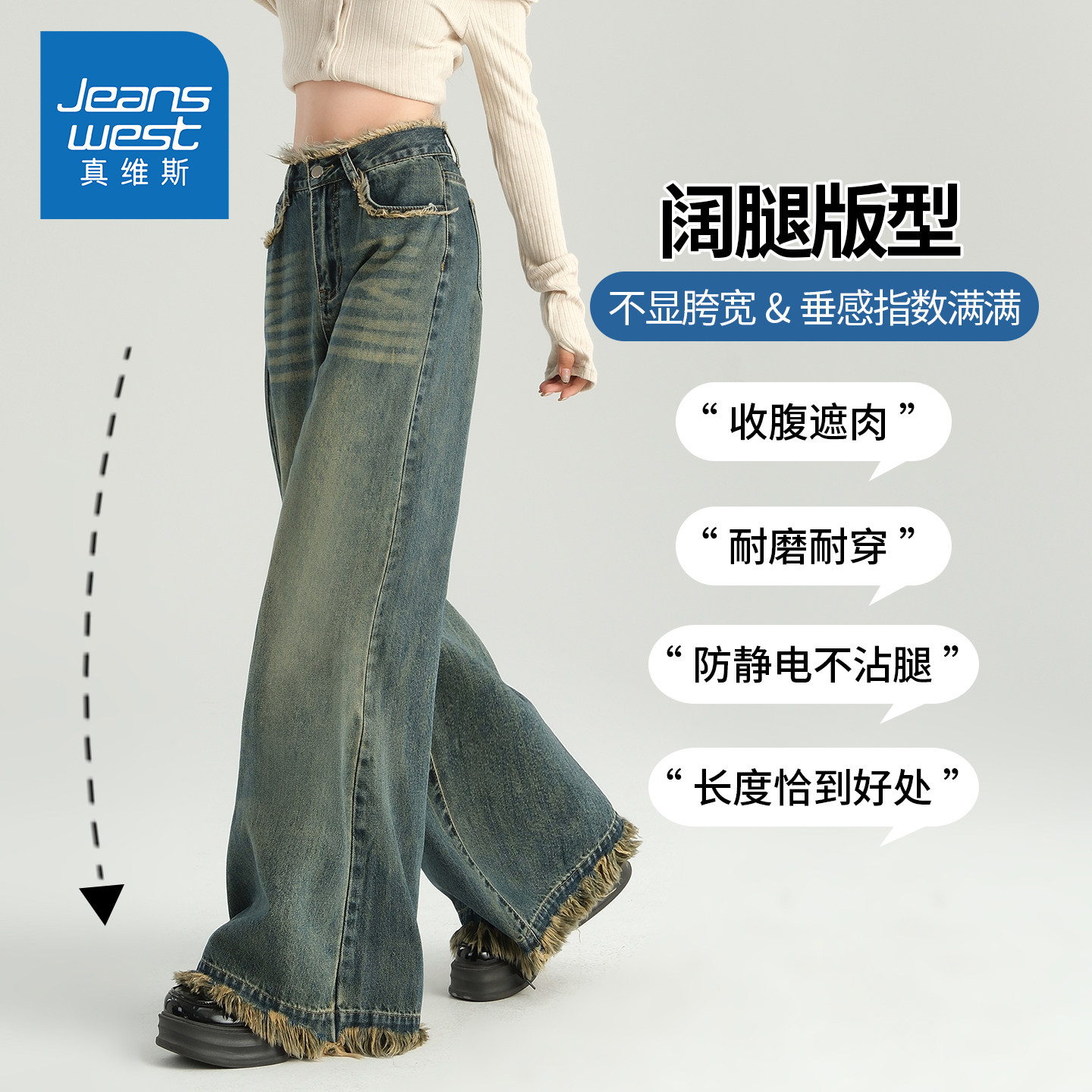 KZH真维斯毛边复古牛仔裤女秋冬新款宽松阔腿裤潮流高腰休闲长裤