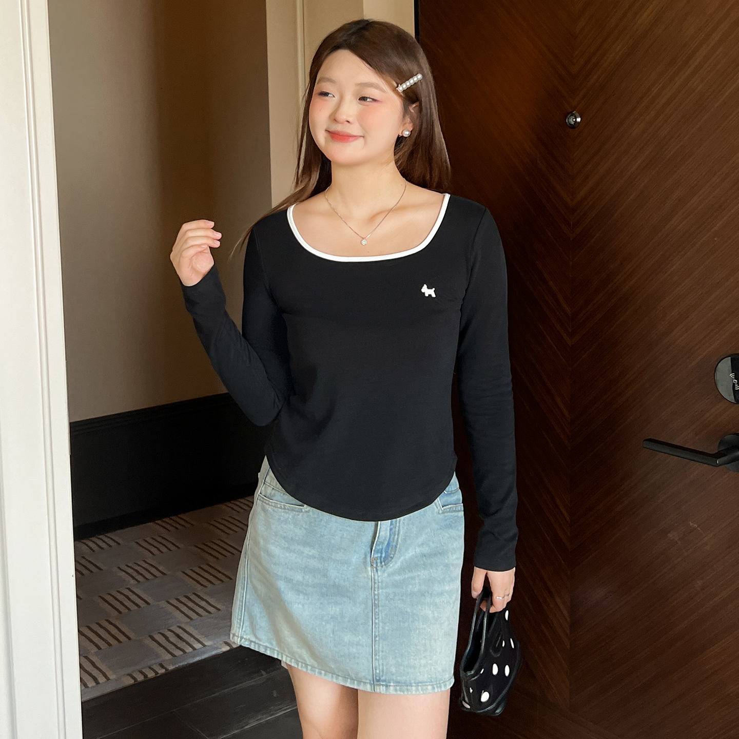 DM100大码百分百女装秋季微胖mm撞色U领刺绣修身打底收腰正肩T恤