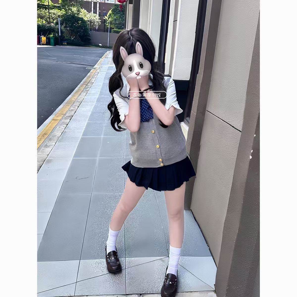 原创JK制服针织衫薄款开衫马甲背心软妹叠穿漫感短袖上衣短裙套装