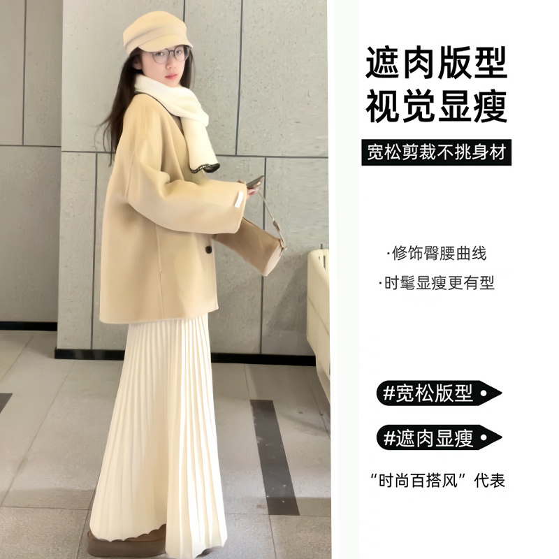 米白色毛呢细褶百褶裙女春秋冬2026新款高腰a字显瘦中长款半身裙