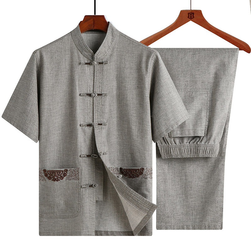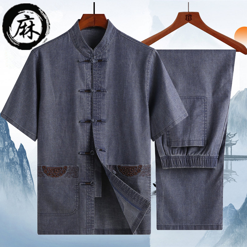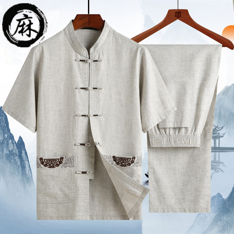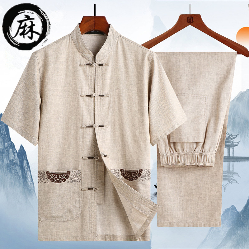 中老年亚麻唐装男套装夏装爸爸短袖中国风男式老人宽松衣服汉服男