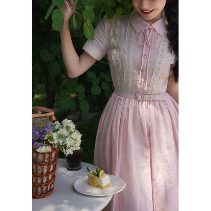青的衣橱 复古vintage收腰腰带正肩短袖蕾丝连衣裙棉麻赫本风伞裙