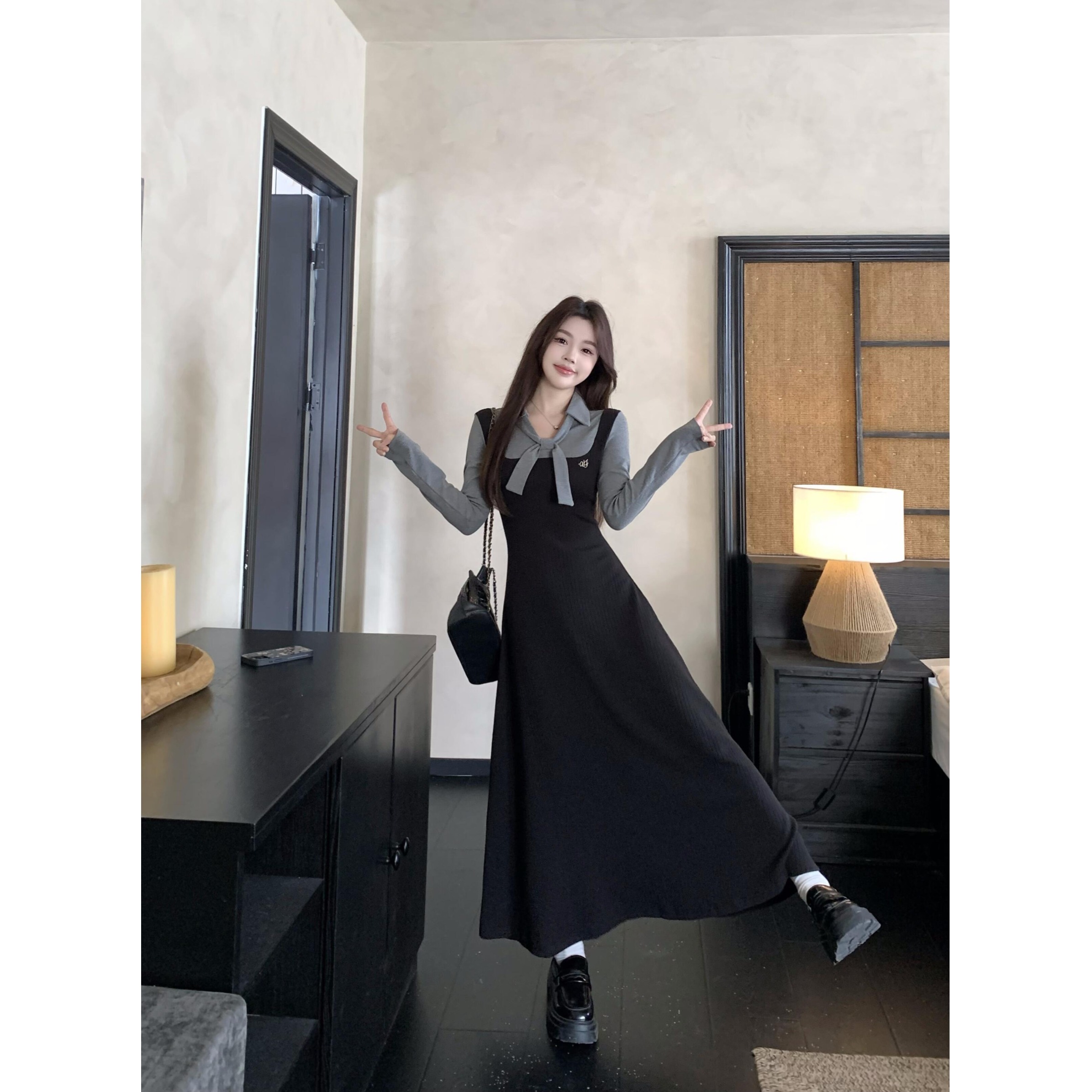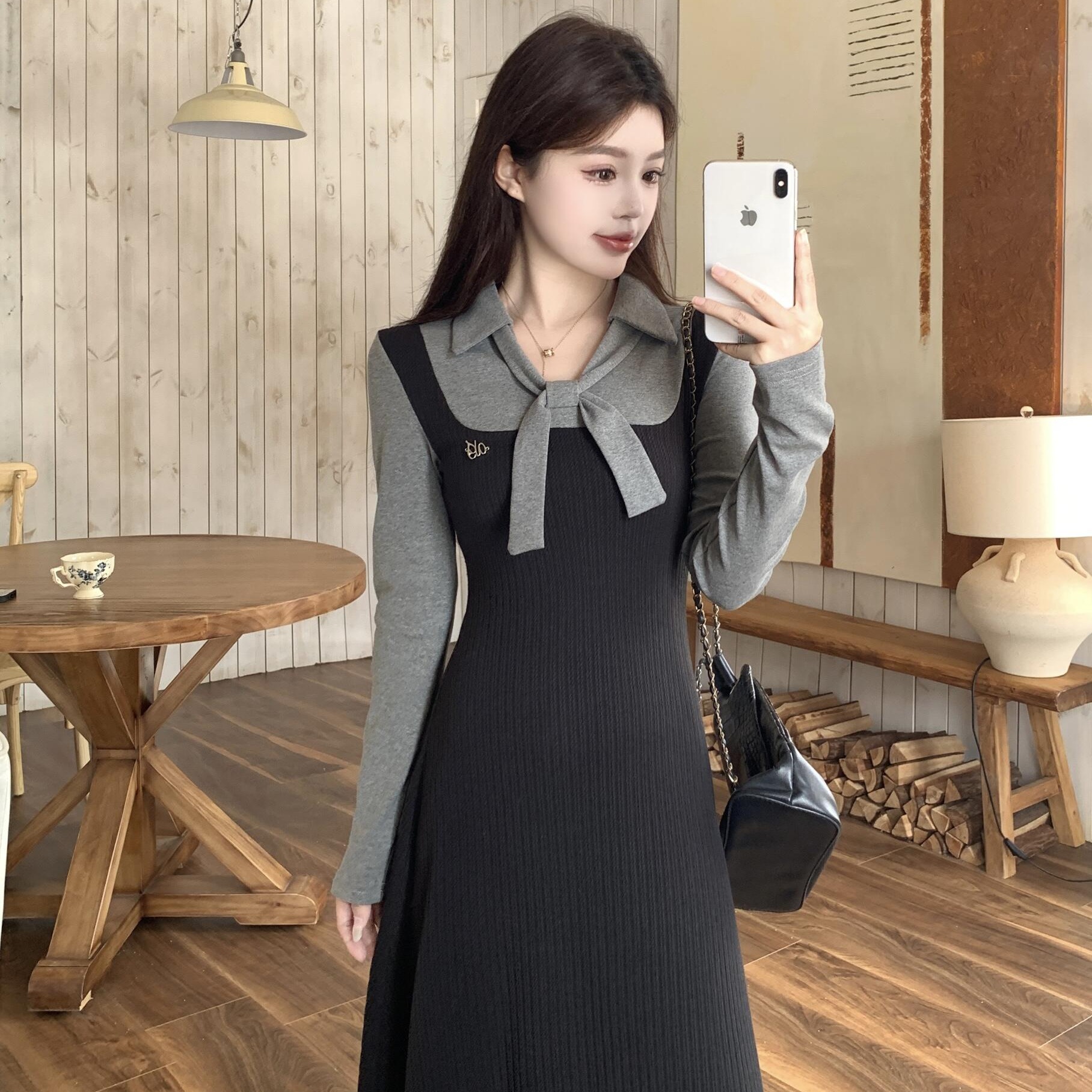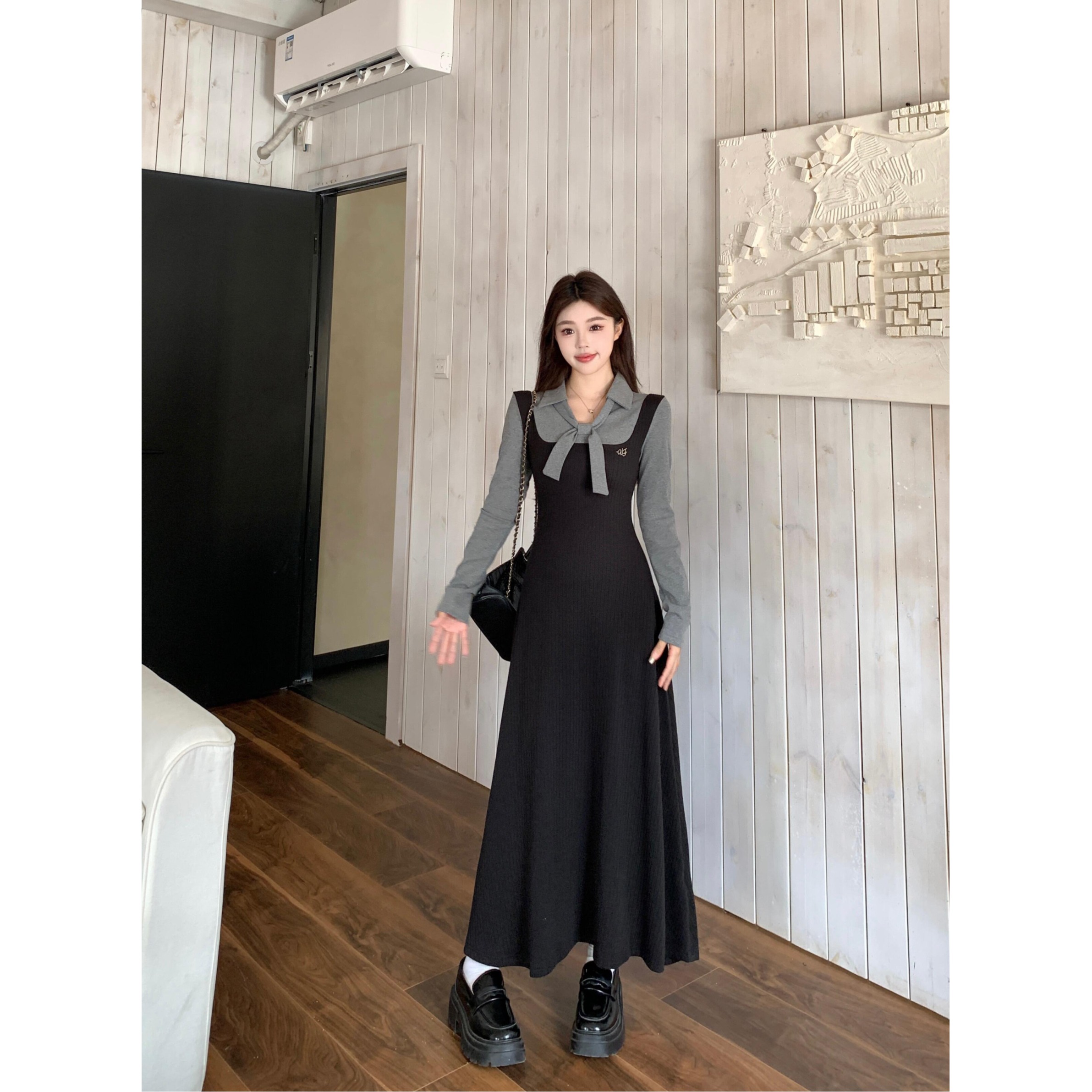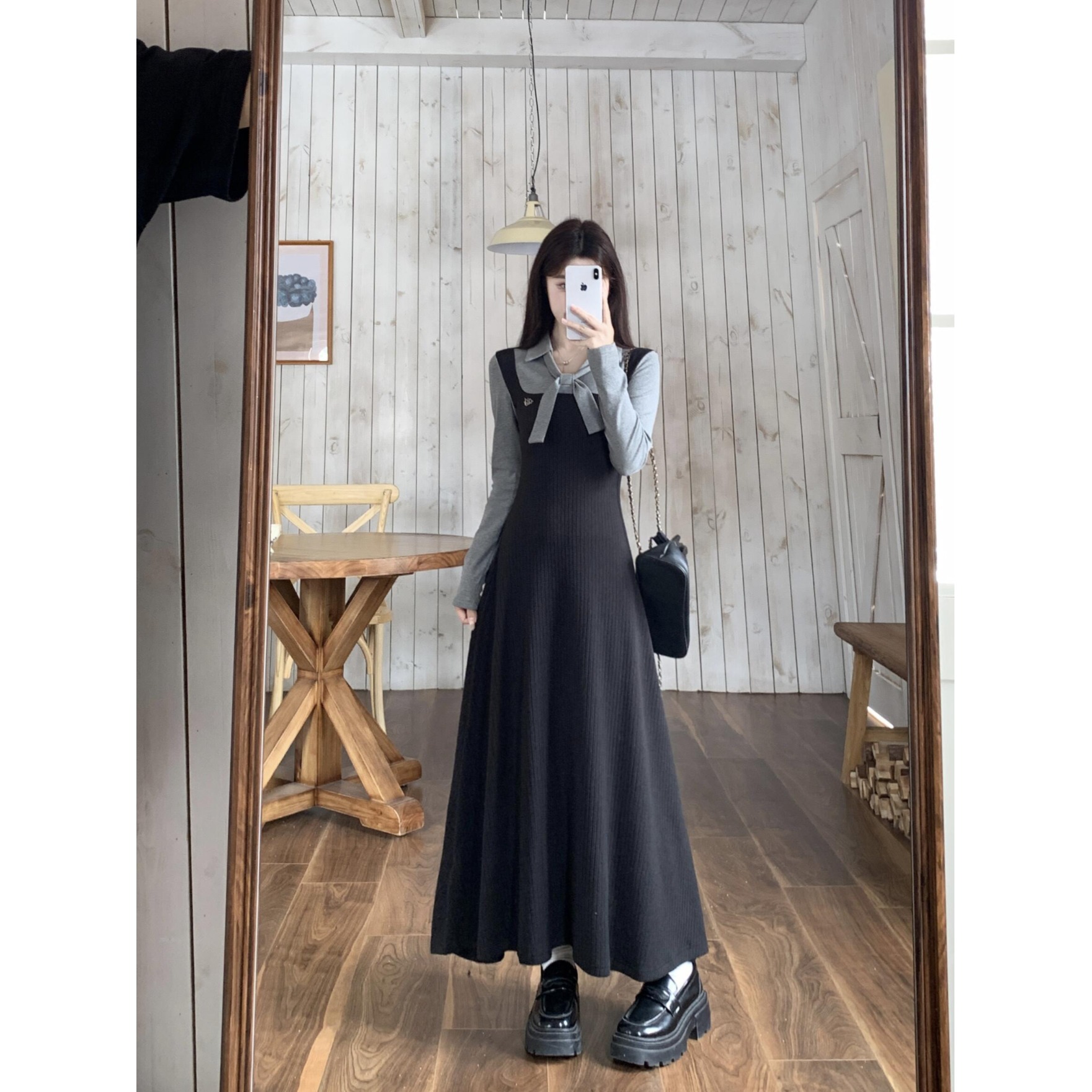 大码胖mm韩系减龄假两件针织连衣裙女秋新款收腰显瘦打底内搭长裙