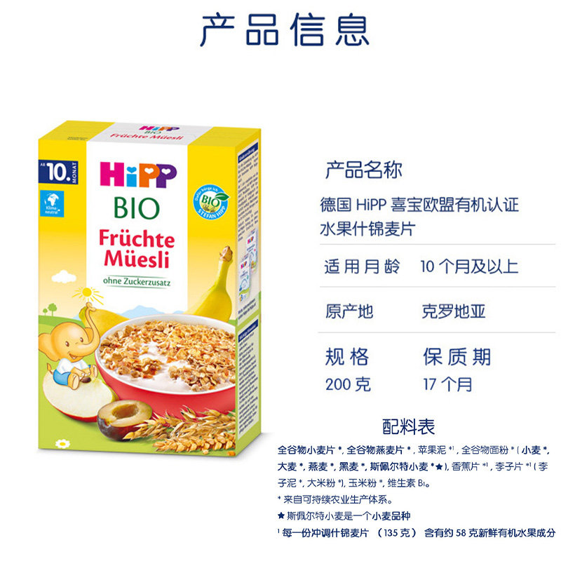 【自营】HiPP喜宝欧盟有机水果什锦麦片宝宝辅食米粉200g/盒