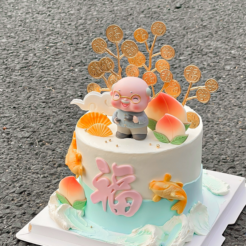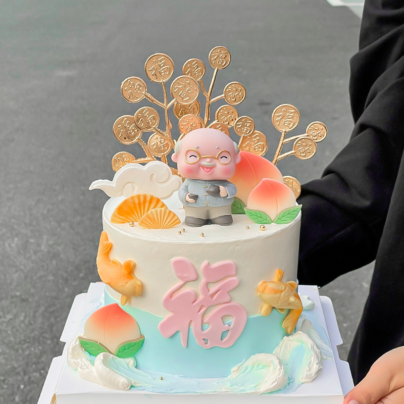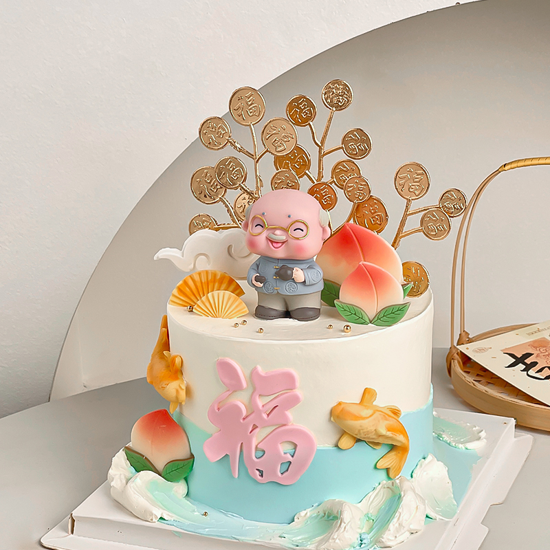 爷爷奶奶祝寿生日蛋糕装饰老头老太太摆件福字金色小树烘焙插件
