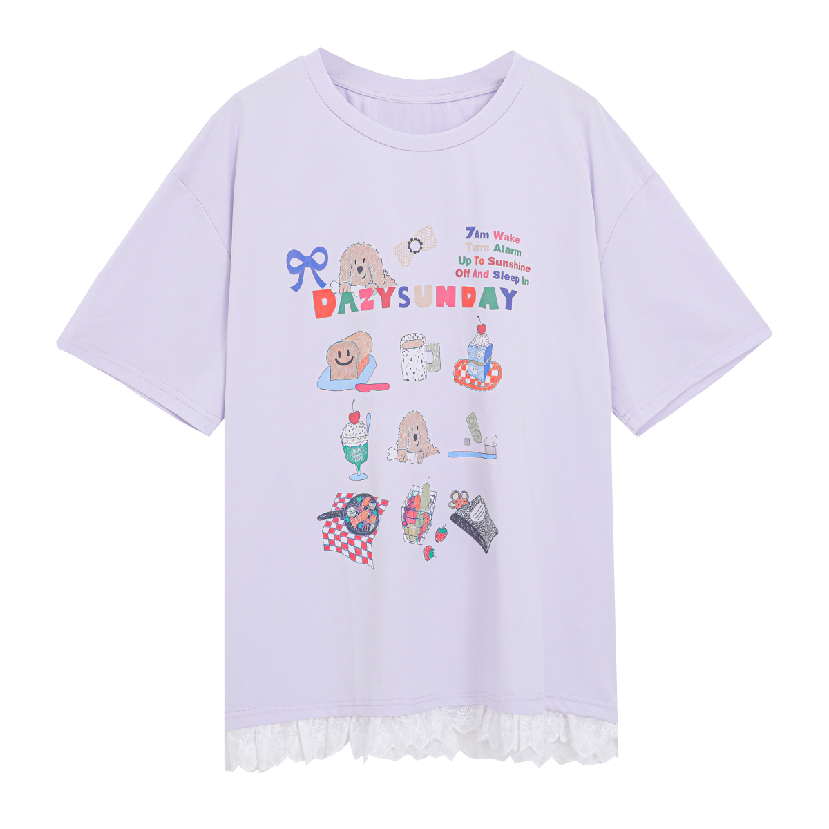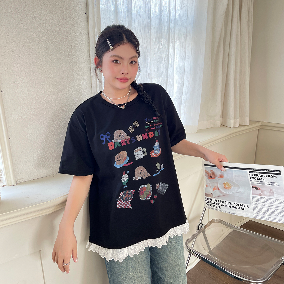 小草宽松定制洋气减龄圆领短袖t恤胖mm大码女装韩系拼接蕾丝上衣