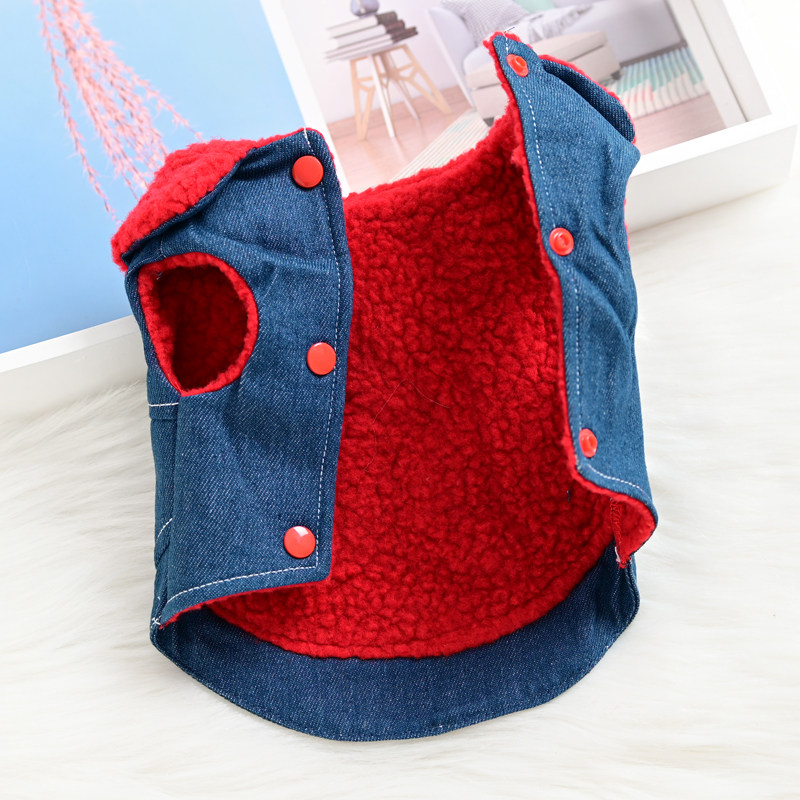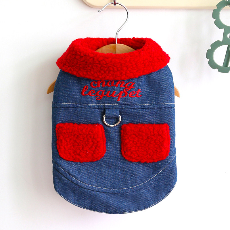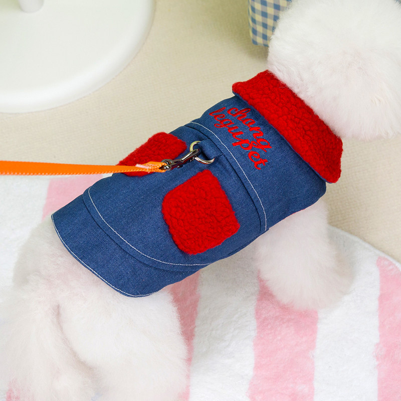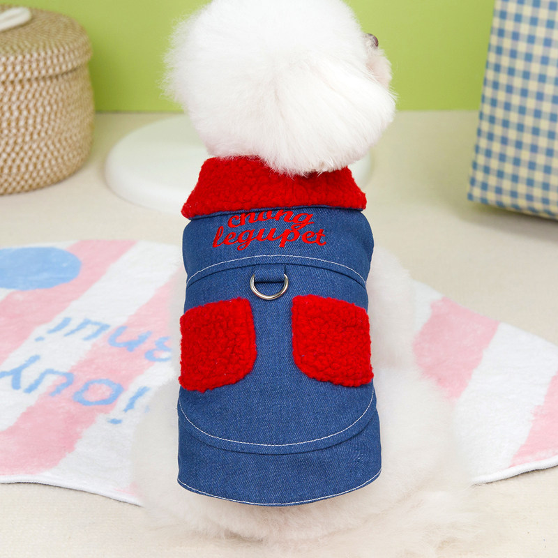 宠物狗狗衣服小型犬秋冬装泰迪比熊保暖加厚牛仔棉衣带牵引绳背心