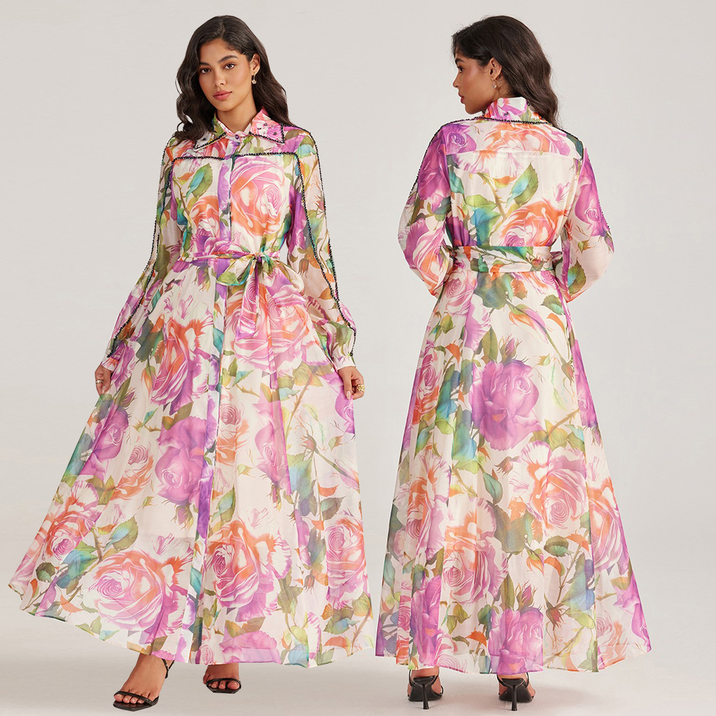 田园风彩色大花很仙的大码连衣裙宫廷风明星重工钉珠走秀礼服长裙
