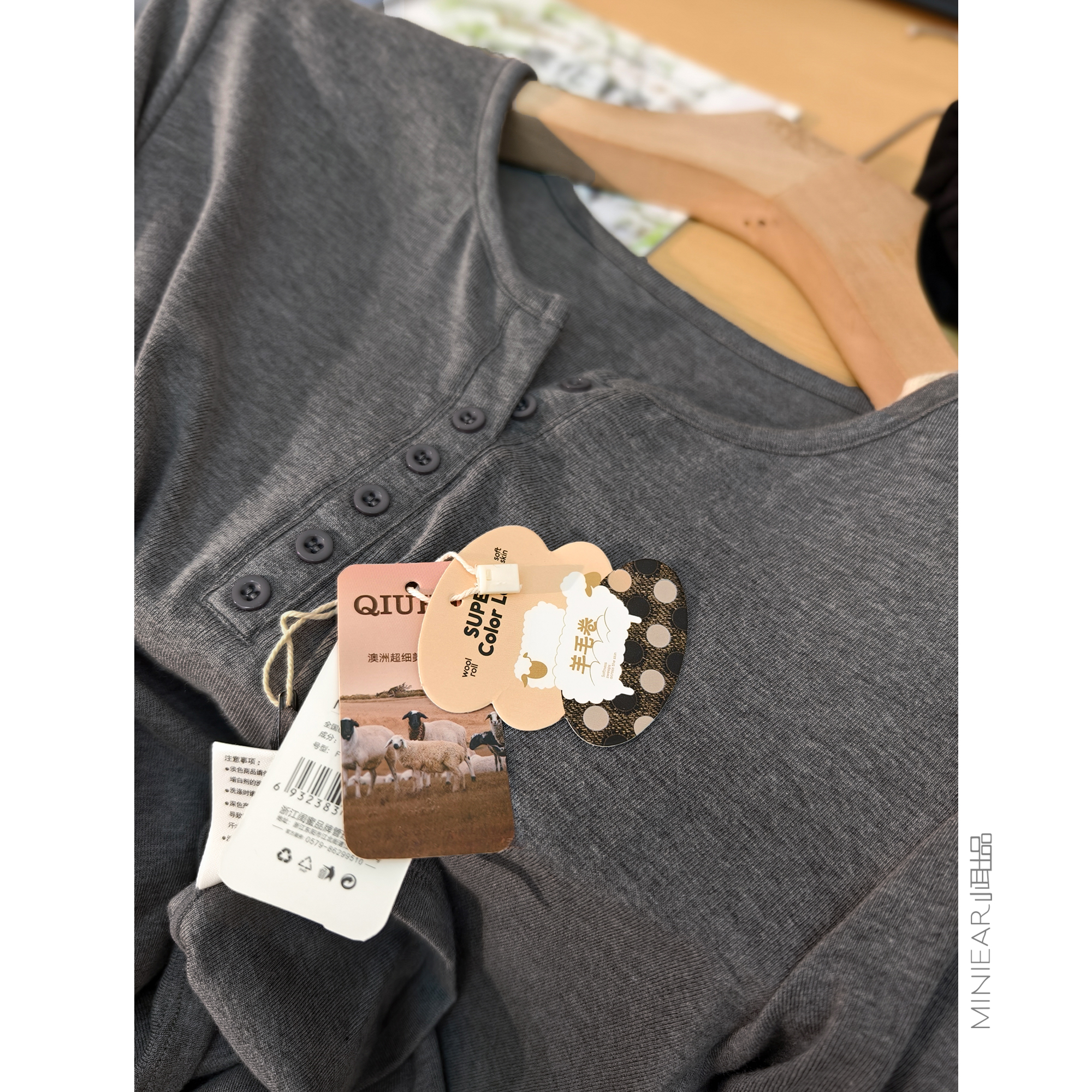 小耳出品【230g/亨利领/羊毛卷/绵羊毛混纺】半门襟弹力长袖T恤