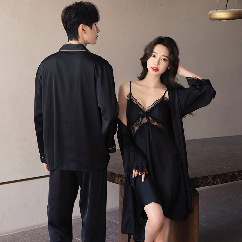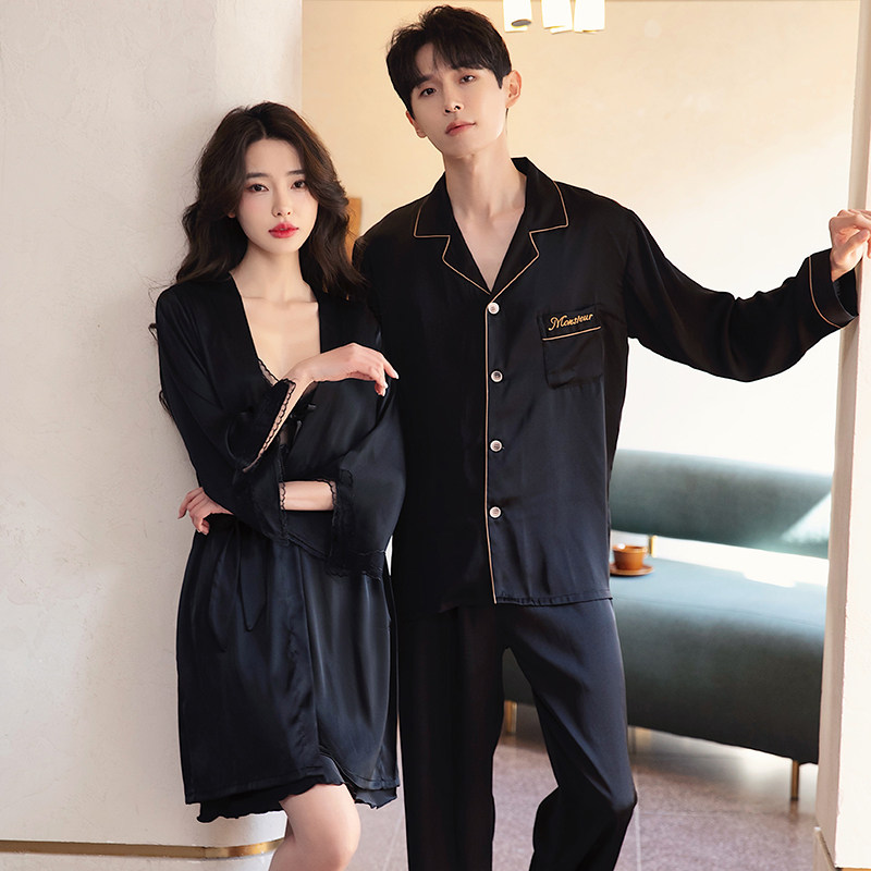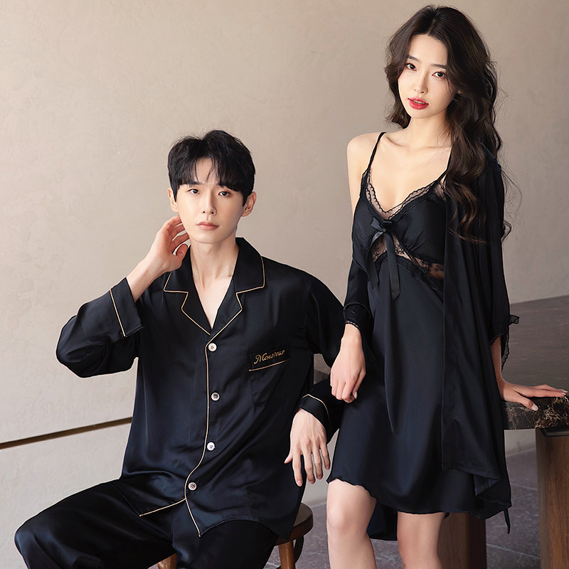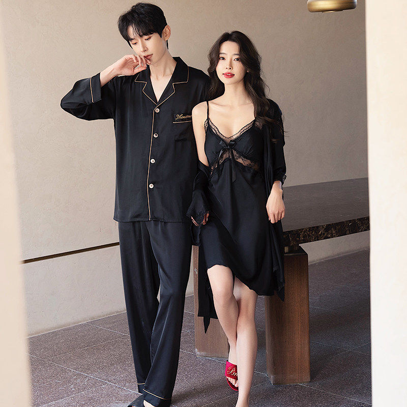情侣睡衣女春秋冰丝薄家居服高级感男士长袖套装性感睡裙两件套夏