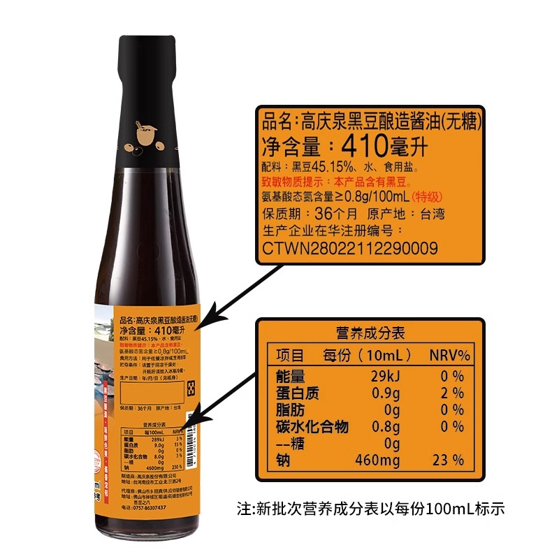 高庆泉无麸质黑豆生抽酱油无碘盐无糖无小麦肤质敏宝桥本调料食品