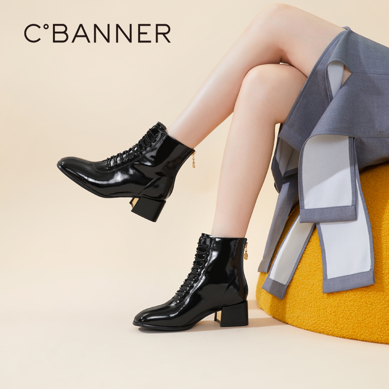 千百度女鞋秋冬朋克漆皮时装靴筒靴短靴中跟靴子潮流粗跟真皮靴子