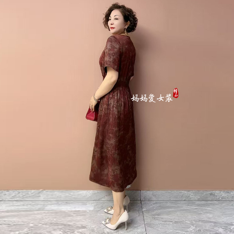 高档阔太太醋酸真丝缎连衣裙夏季新款时尚妈妈大码收腰显瘦长裙子