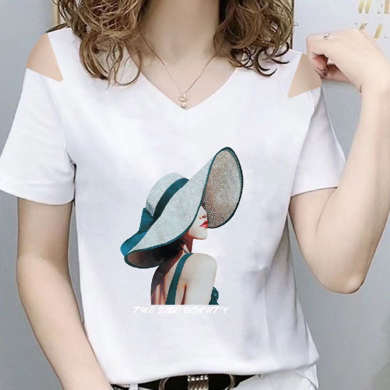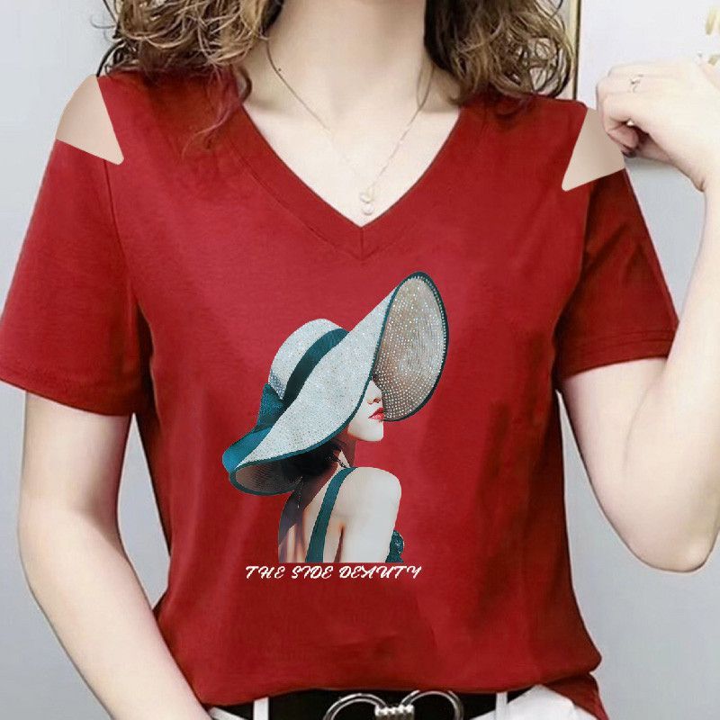 纯棉黑色露肩短袖t恤女印花v领遮肉夏2025洋气体恤鸡心领显瘦上衣