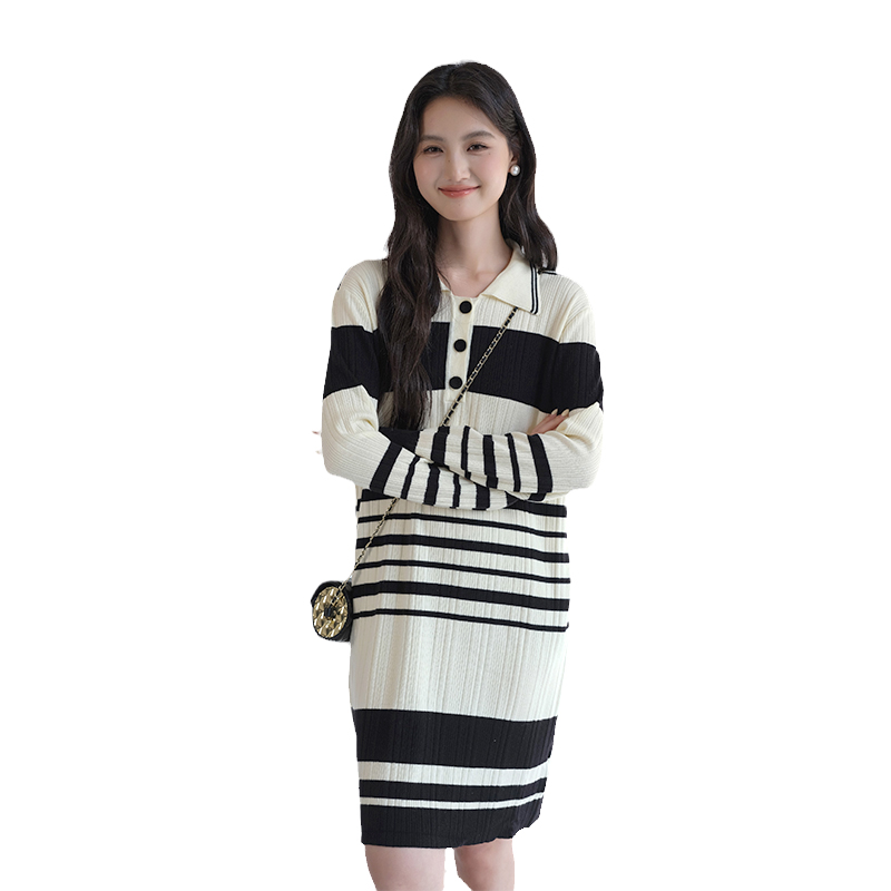 蓝若水大码女装条纹Polo领连衣裙胖mm秋装显瘦打底针织裙
