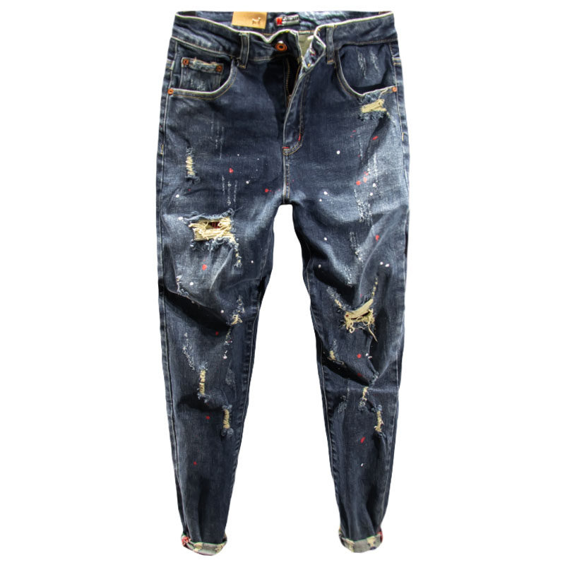 三古木棉原宿风补丁裤子男ins超火潮流百搭破洞牛仔裤男修身小脚