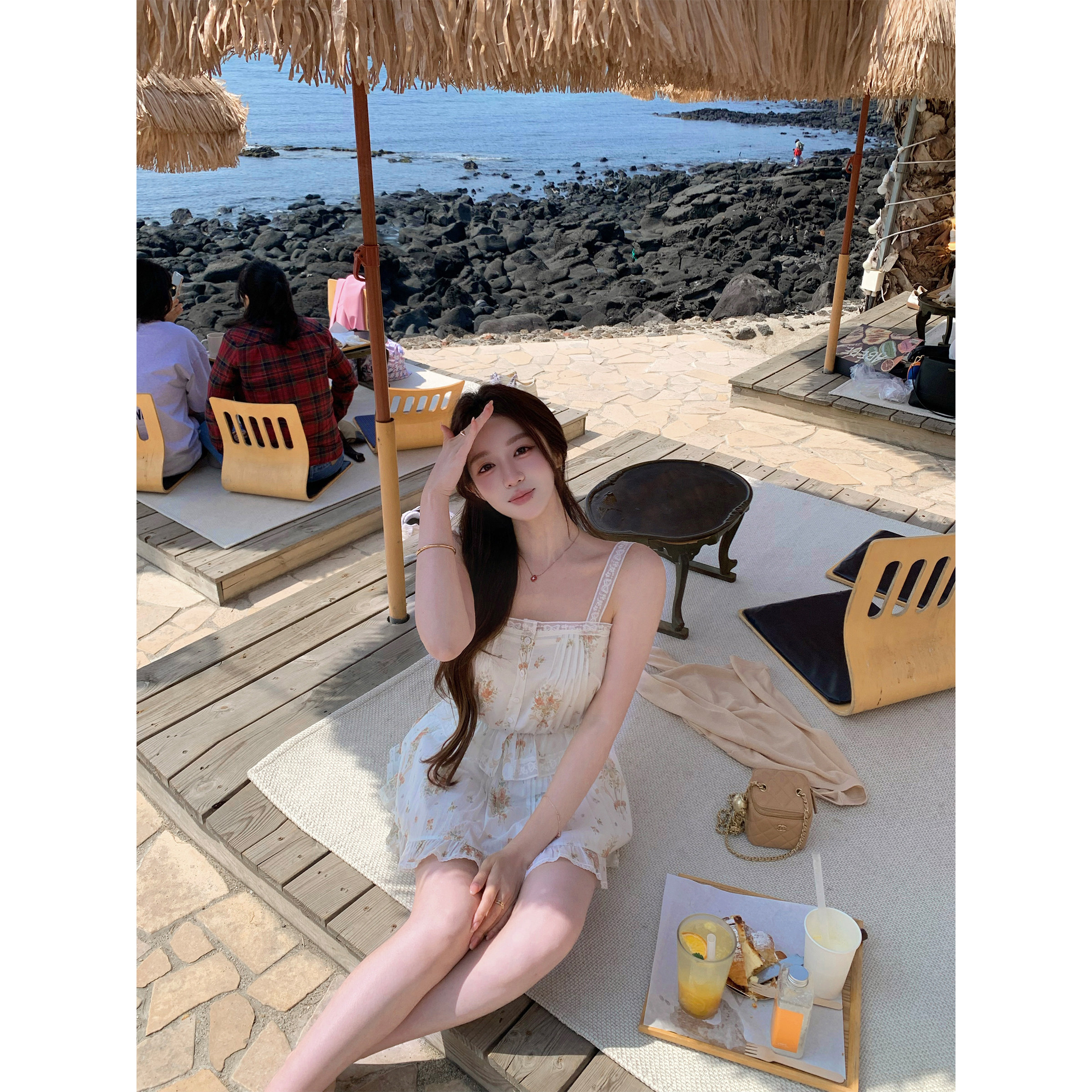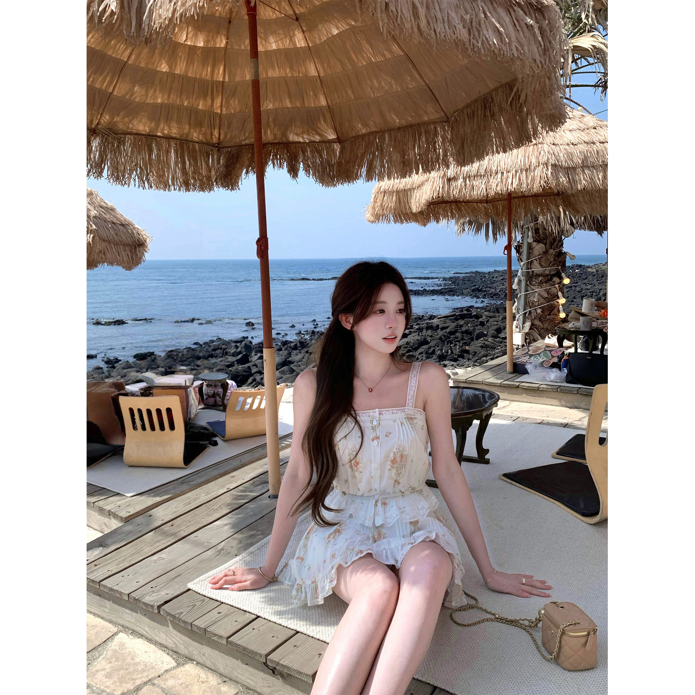 萌萌Ja收腰吊带上衣花A字半身裙