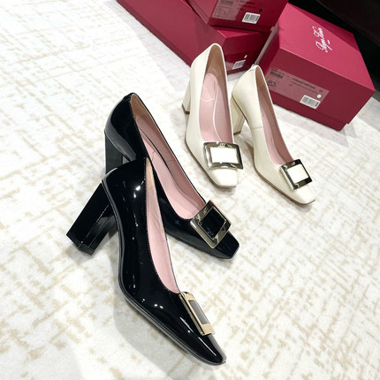 Royeer Viuoar 经典RV女鞋高跟金属扣漆皮单鞋粗跟ol通勤浅口方扣