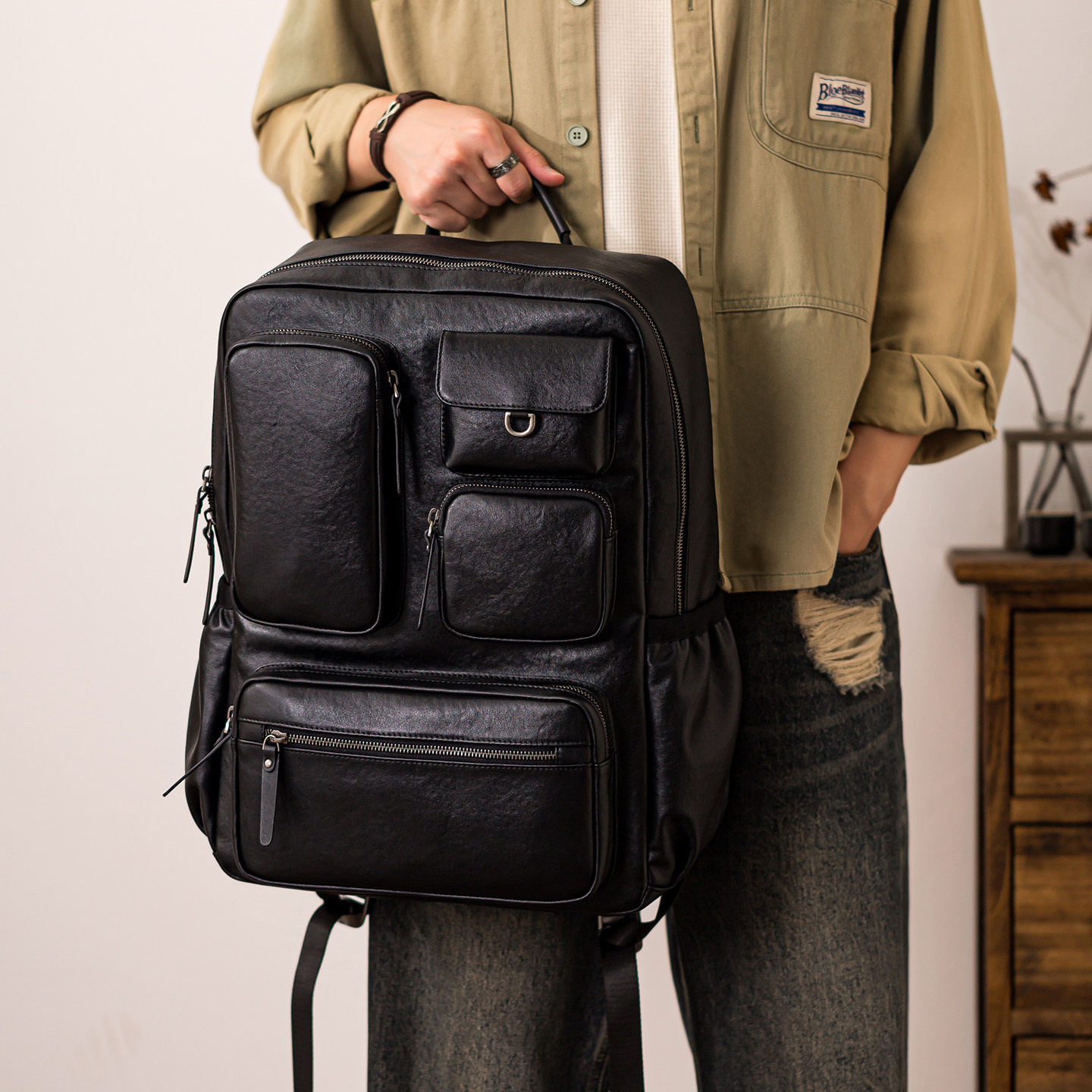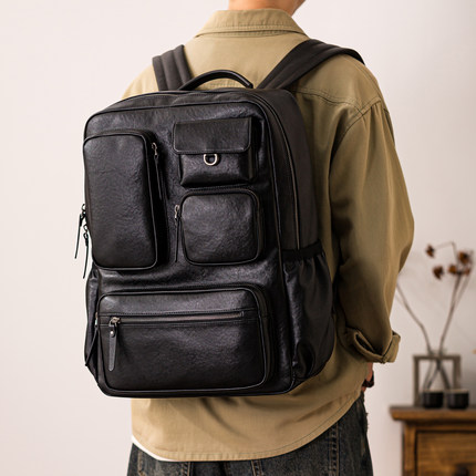 后步男士真皮双肩包头层牛皮大容量潮牌工装多口袋电脑背包旅行包