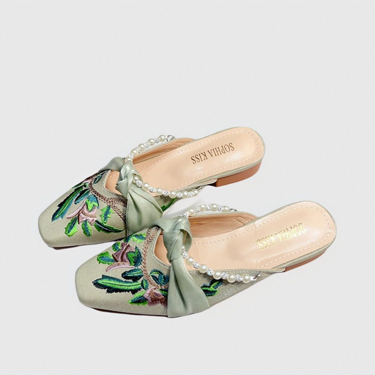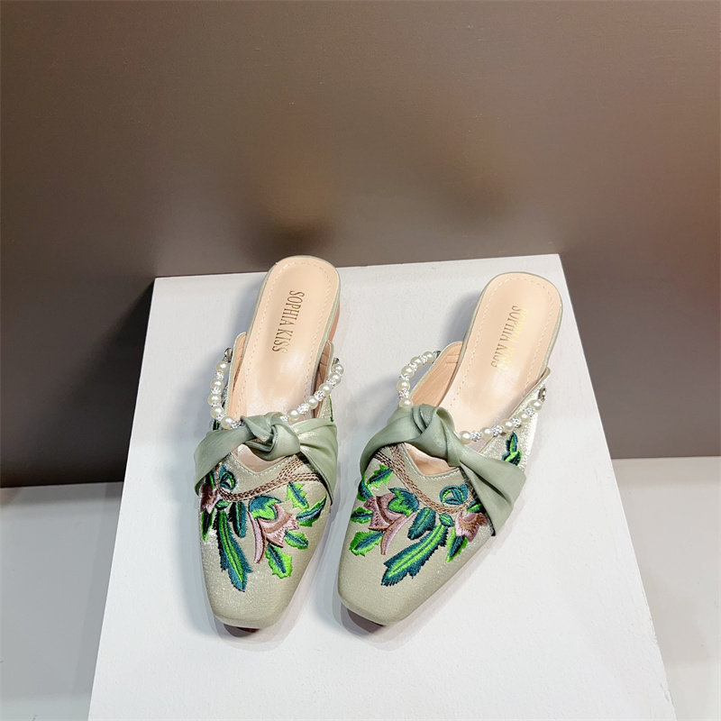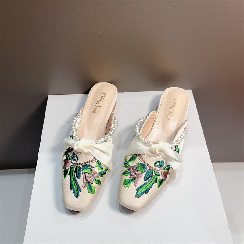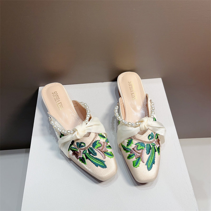 复古风绣花低跟包头半拖鞋女穆勒鞋2025年新款珍珠水钻粗跟凉拖夏