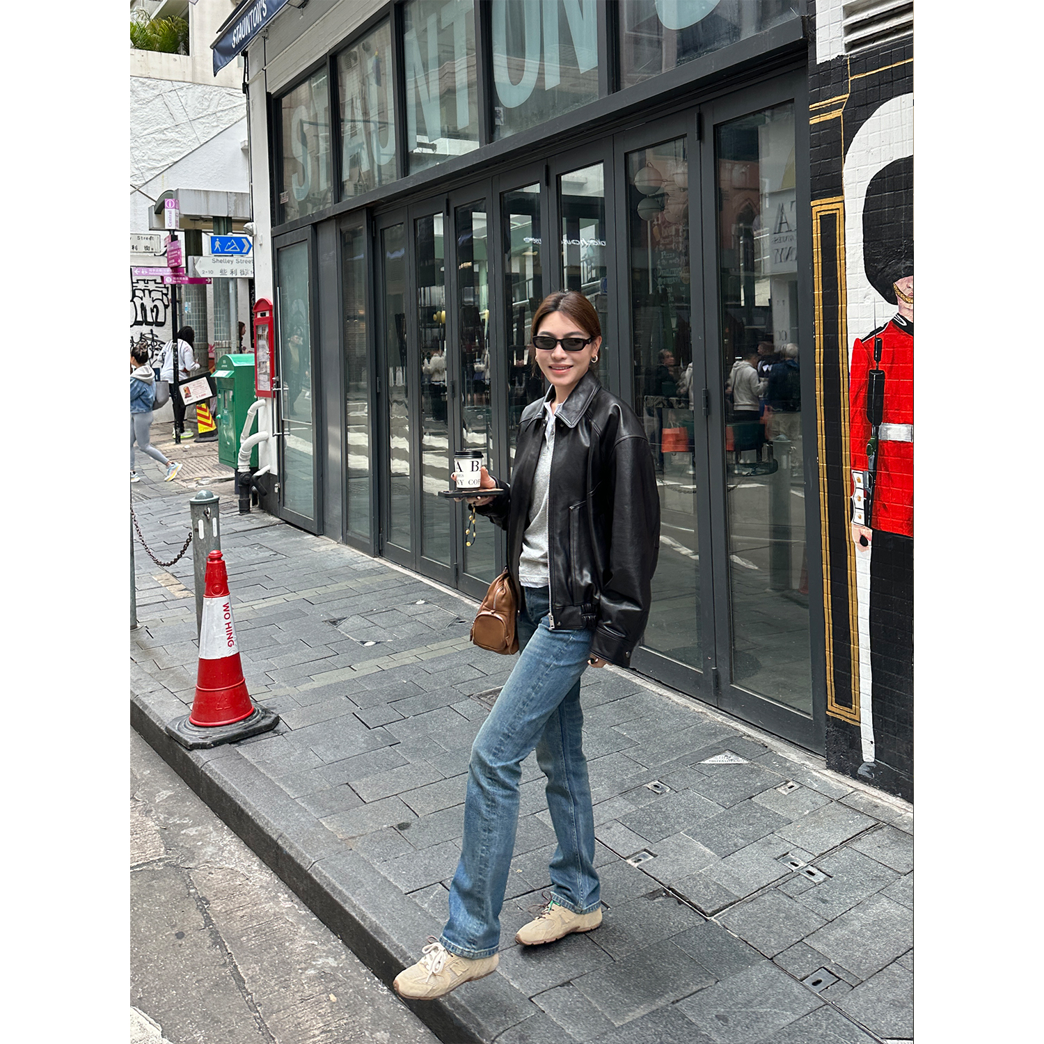 YANGLE_黑色皮衣女款2025秋季新款宽松廓形轻蜡感绵羊皮夹克外套