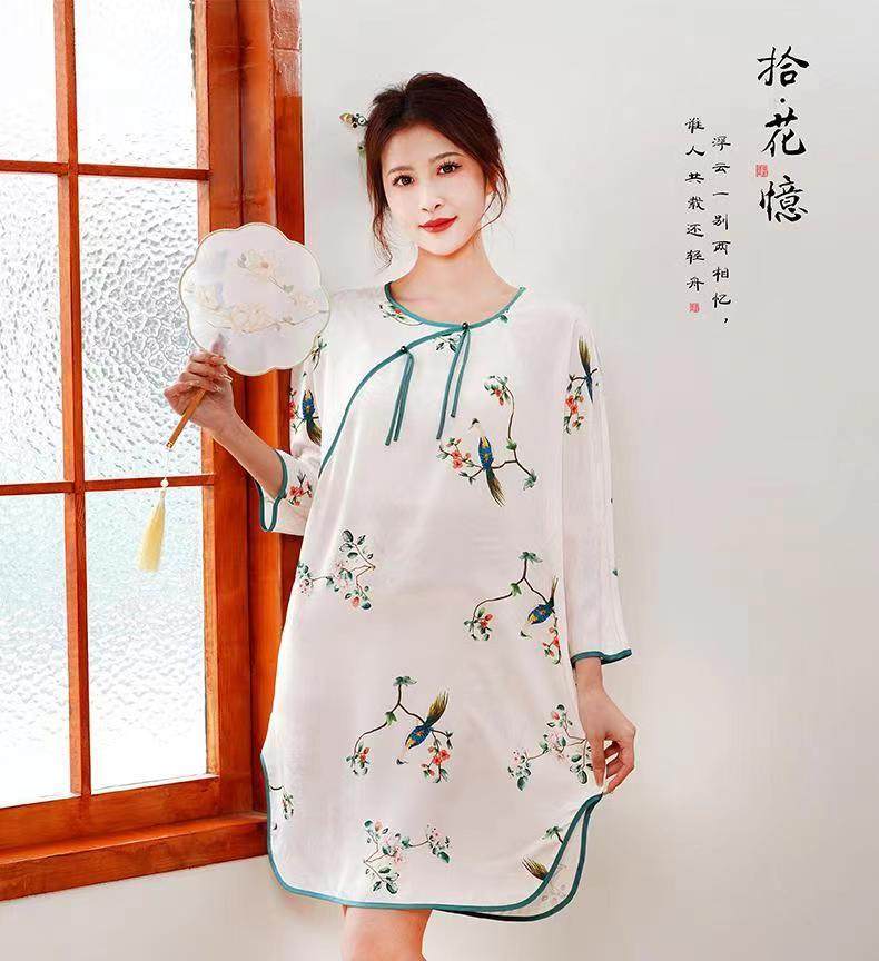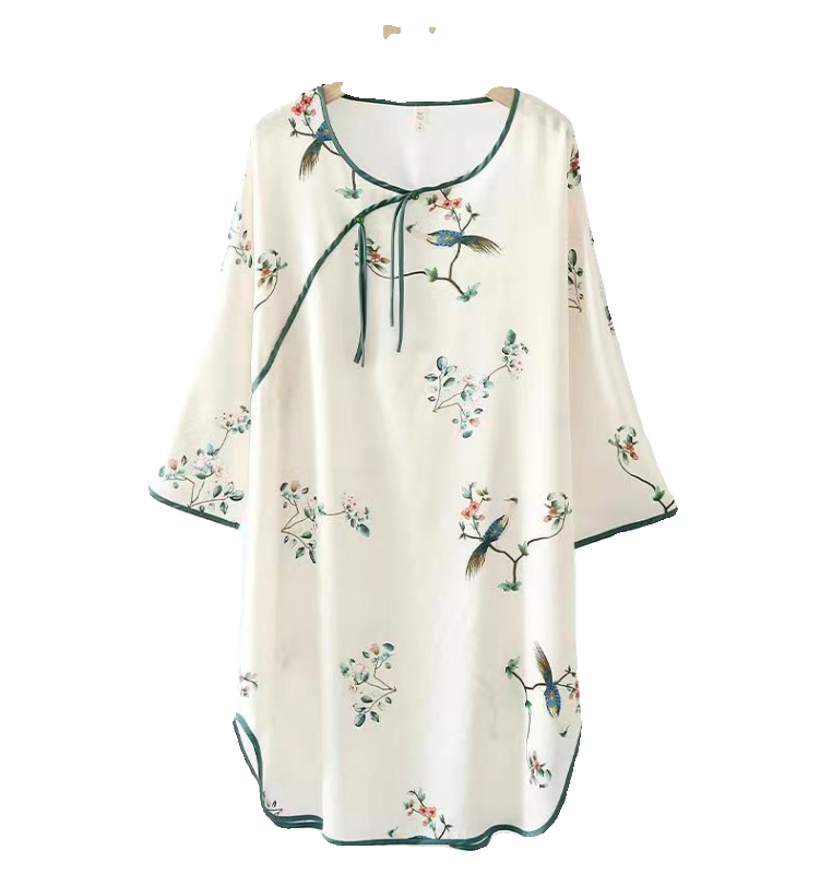中国风冰丝睡裙女夏季七分袖睡衣300斤丝滑凉感中式连衣裙可外穿