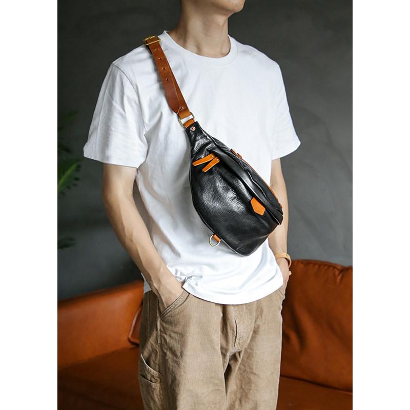 古造真皮男士胸包头层牛皮复古撞色风手机潮牌运动斜挎手拎小背包