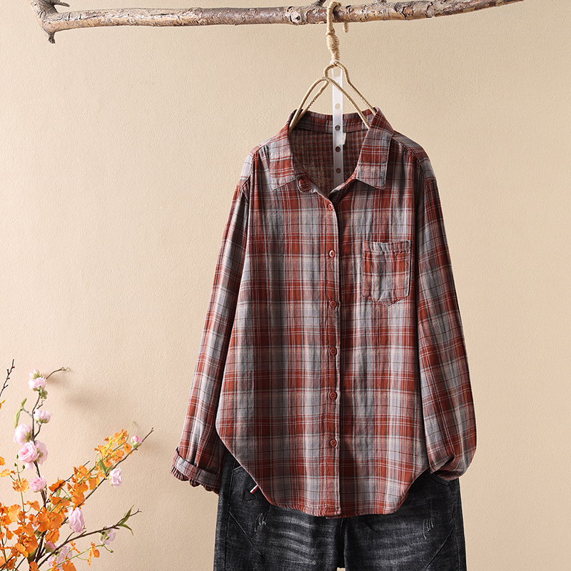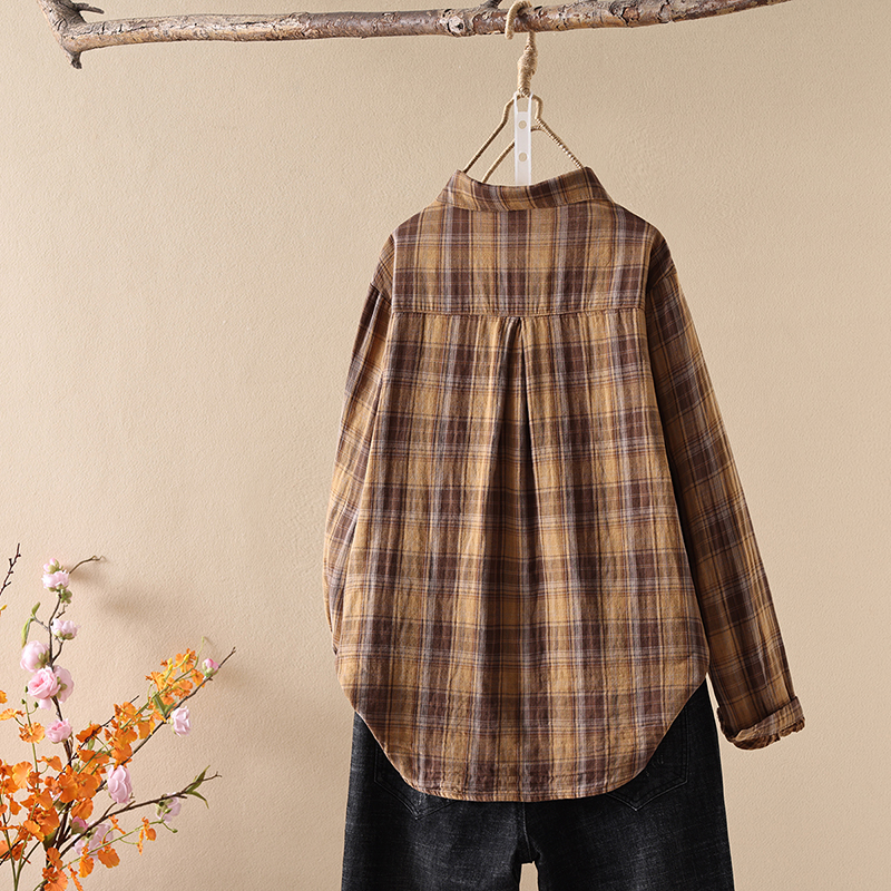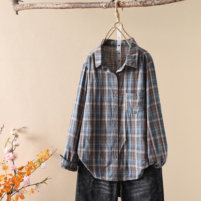 文艺双层棉纱格子衬衫女春秋季新款宽松显瘦百搭色织纯棉长袖衬衣
