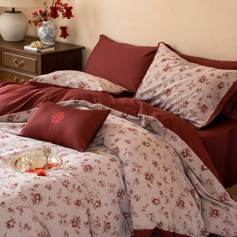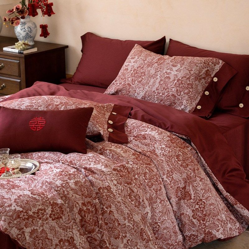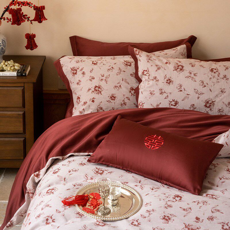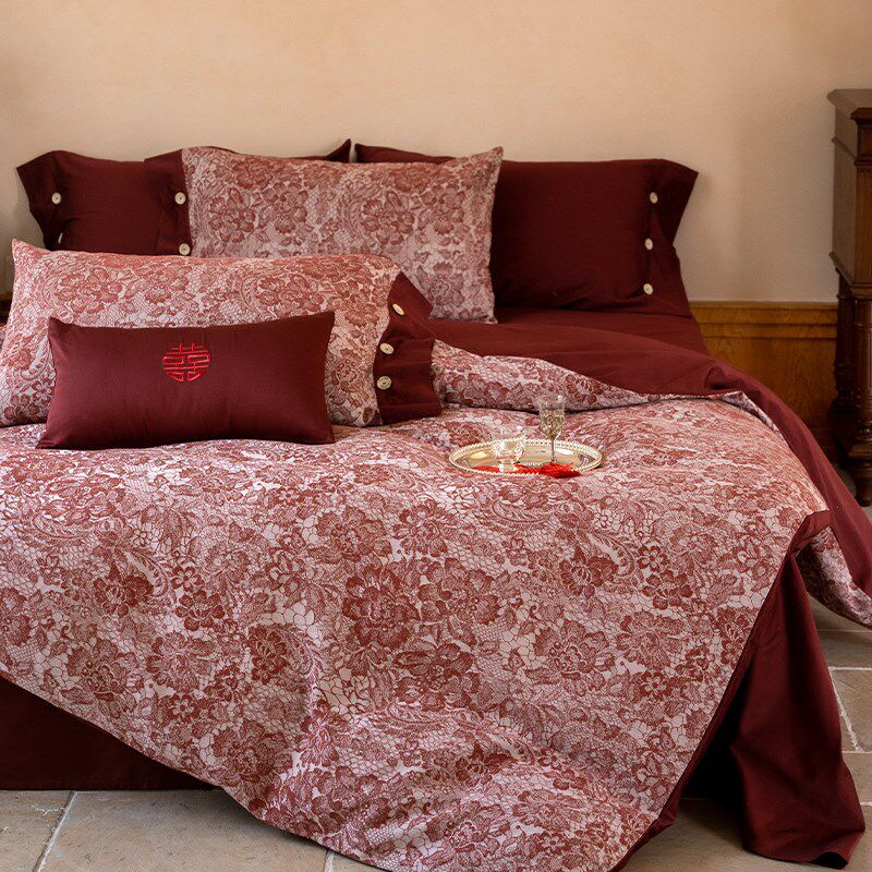 中式婚庆A类60支全棉长绒棉四件套色织提花被套红色结婚床单床品