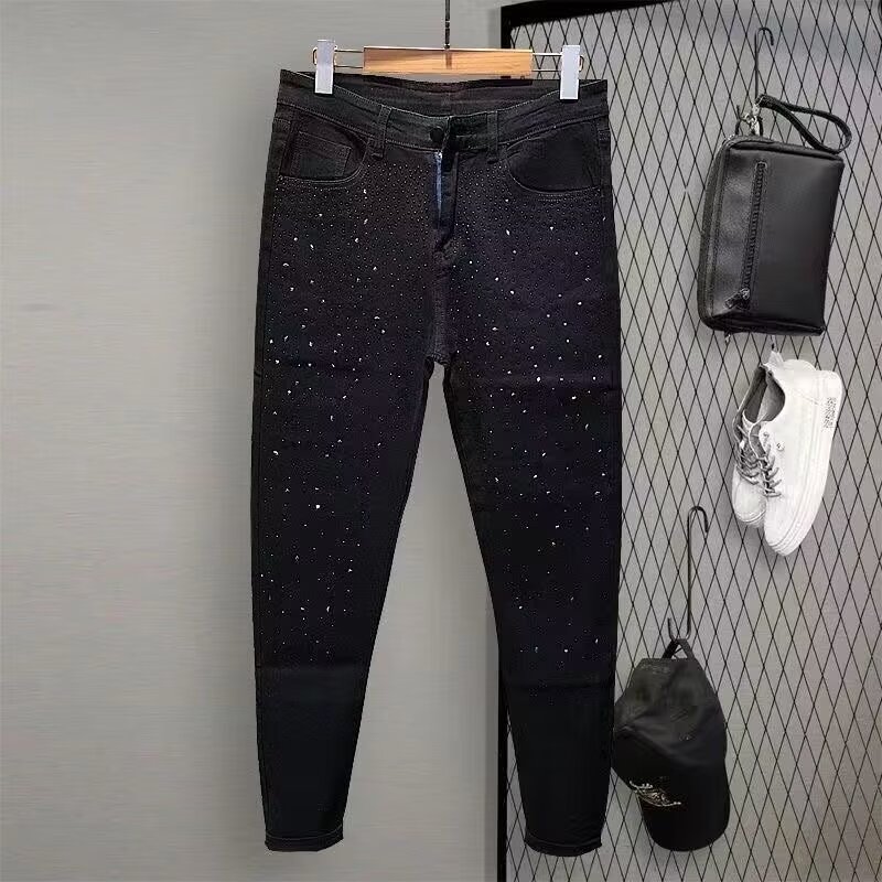 网红修身牛仔裤男款满天星烫钻黑色长裤潮牌百搭弹力小脚星空裤子
