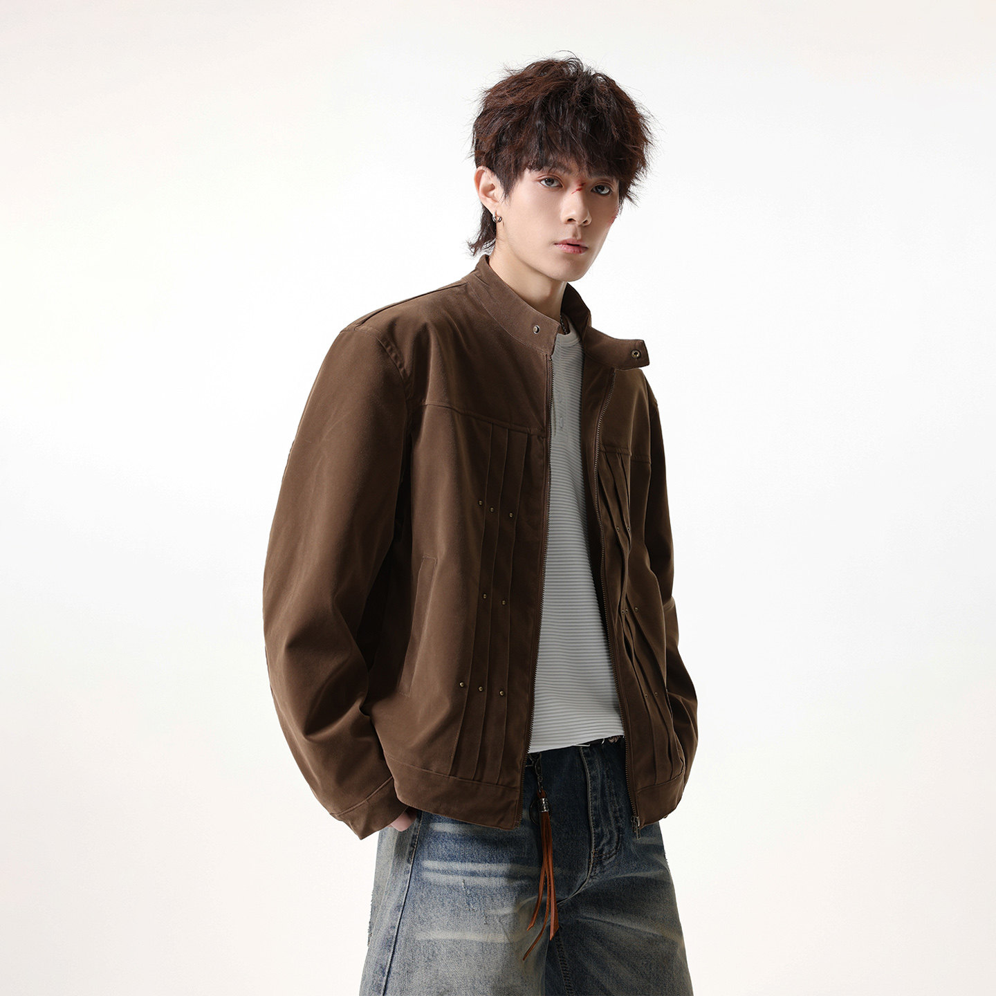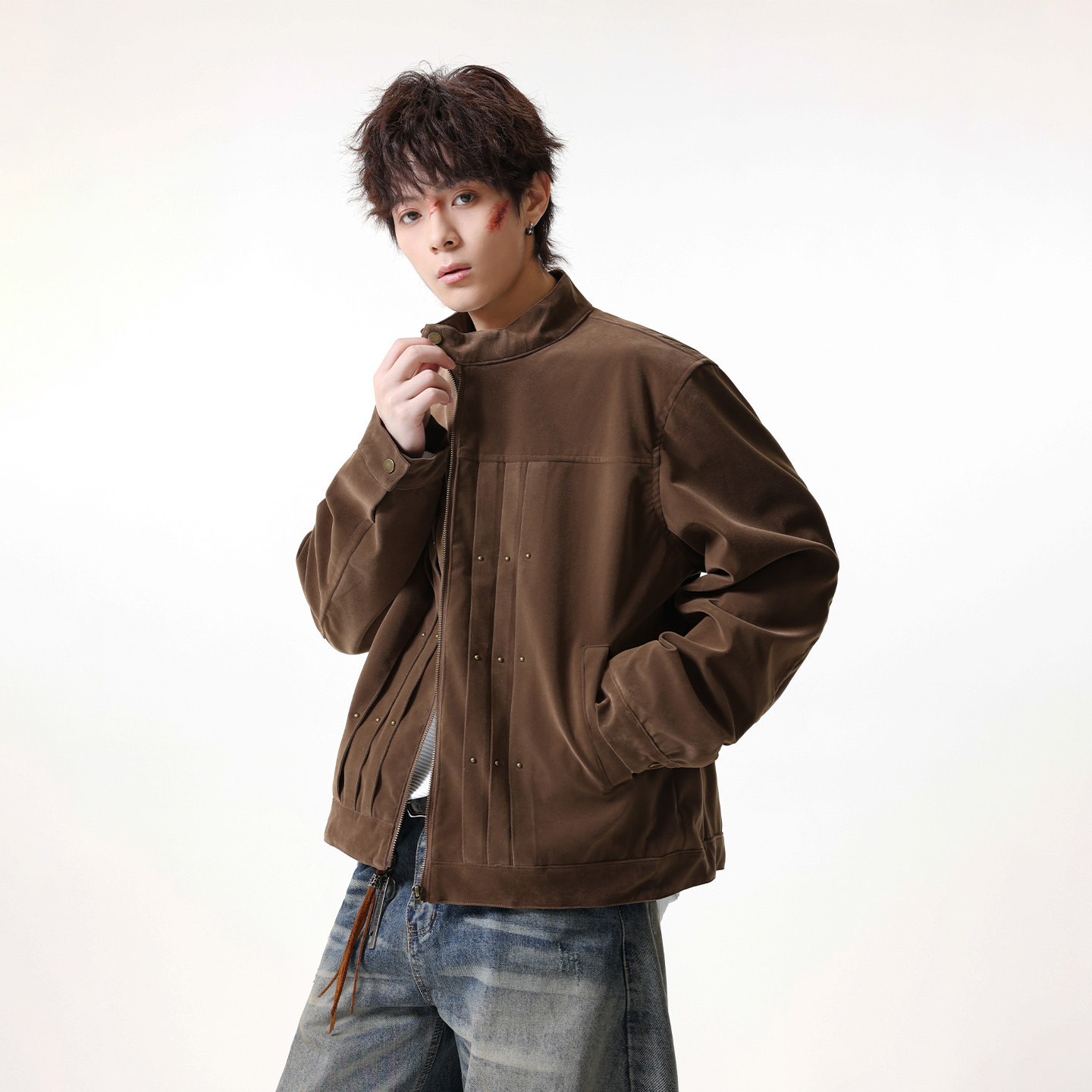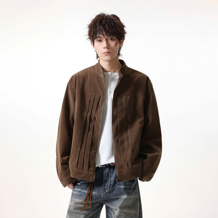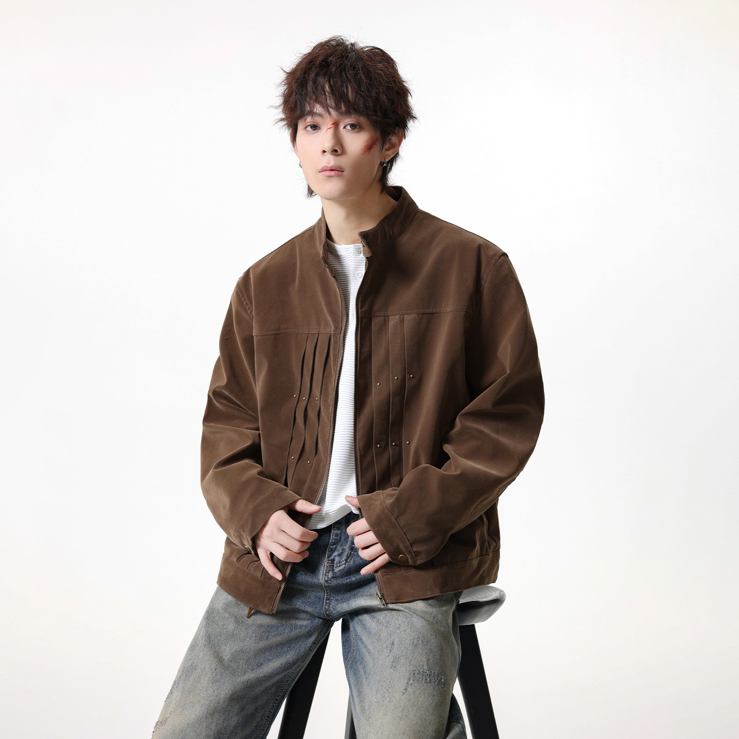 JIINOO美式复古绒皮立领工装夹克男2026春潮牌百搭宽松外套