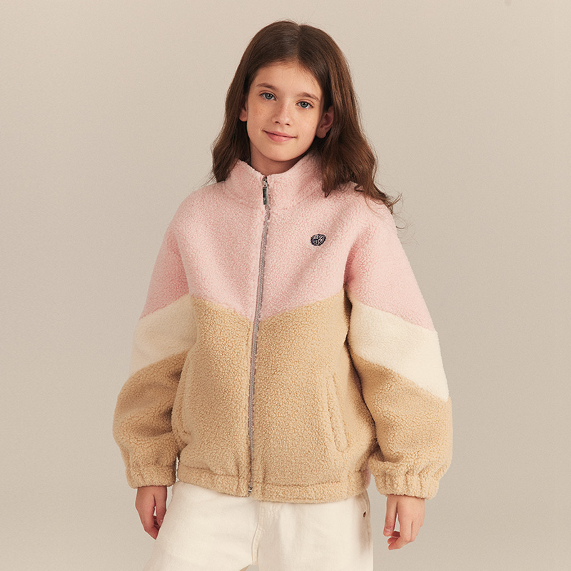 eland kids衣恋童装女童外套春秋季刺绣撞色拼接立领仿羊羔绒上衣