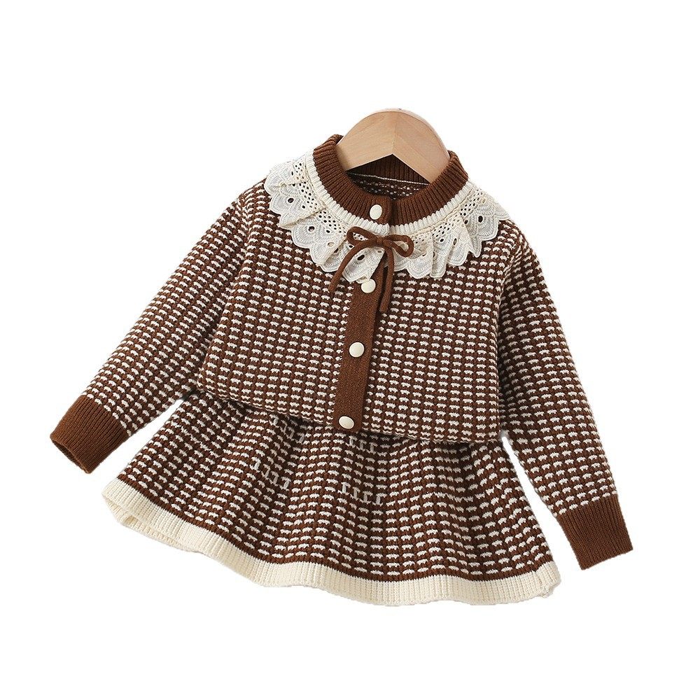 女童毛衣套装春秋冬款蕾丝领花边针织套裙女宝宝韩版洋气长袖开衫