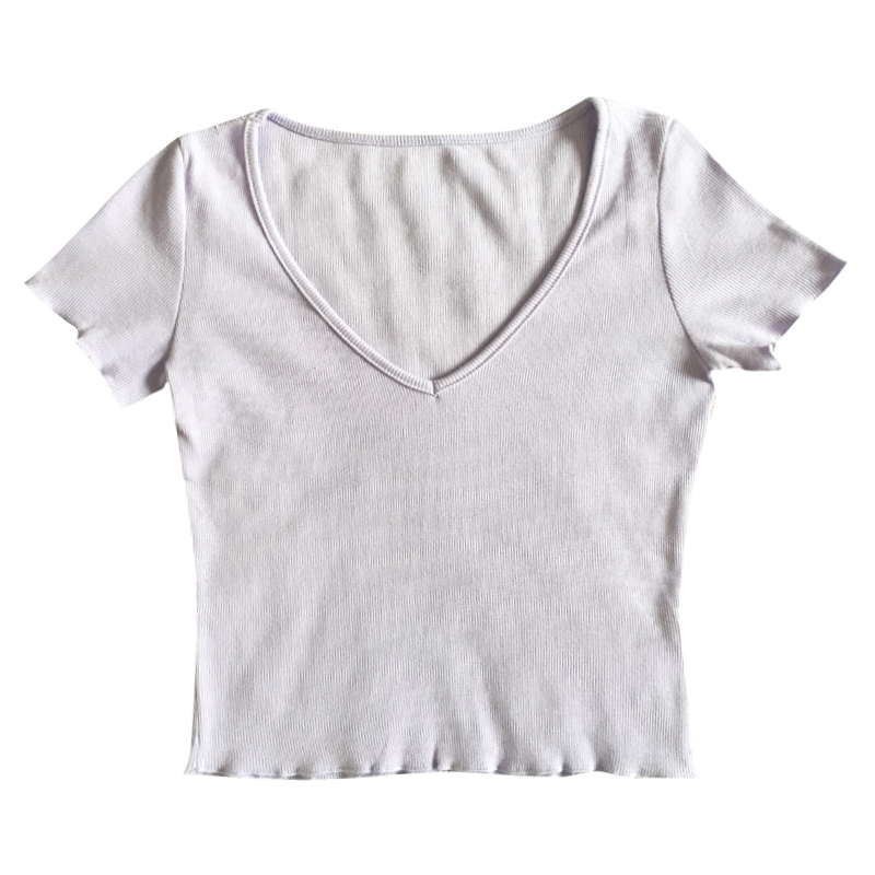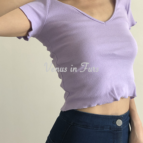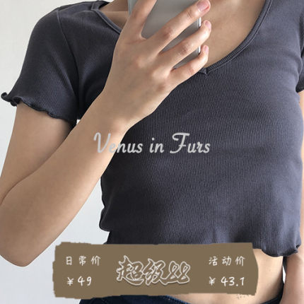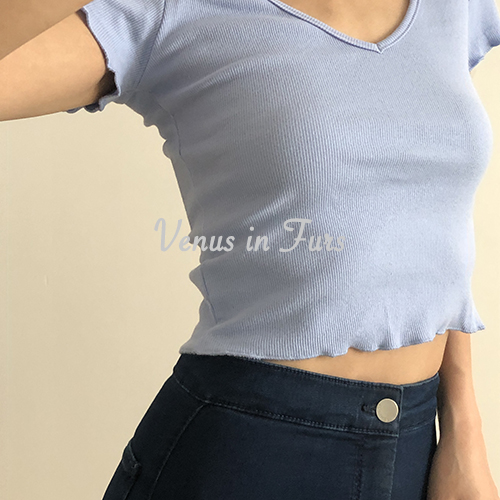 包邮 欧美复古 百搭少女多色高腰短款V领木耳边修身显瘦短袖T恤