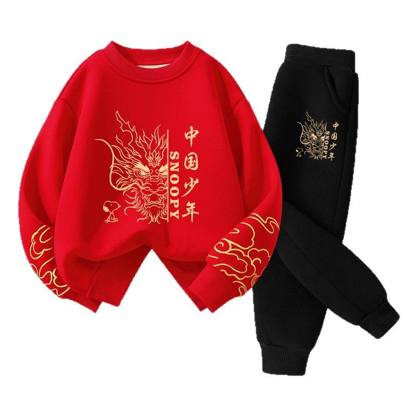 史努比儿童2026马年本命年加绒卫衣套装男女童过年喜庆红色拜年服