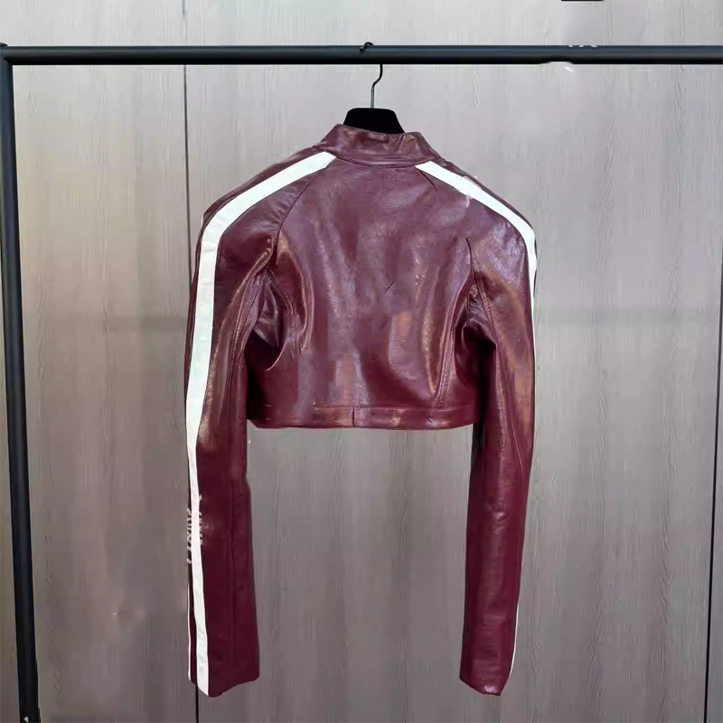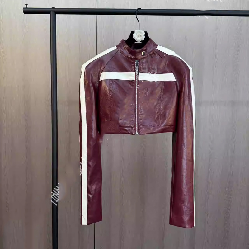 美式独特条纹拼接复古短款PU小皮衣外套女春季辣妹新款百搭机车服